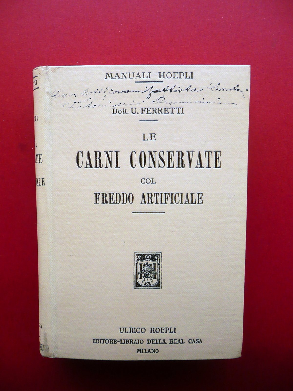Dott. Uberto Ferretti, Le Carni Conservate col Freddo Artificiale con 83 incisioni Hoepli, Milano 1911; cm 15,5x11; pp. XVI-500, con 83 fig. in b/n nel t. e fuori t.; tutta tela ed.; tagli rossi. Piatto ant. con nome del precedente proprietario annotato a penna. Condizioni di conservazione Esemplare in buono stato con tracce d'uso, lievemente ammaccato. margini sup. e inf. del piatto post. con poche leggere tracce di pieghette. Interni buoni. Prima edizione (1911). SETT11.L19146 N P