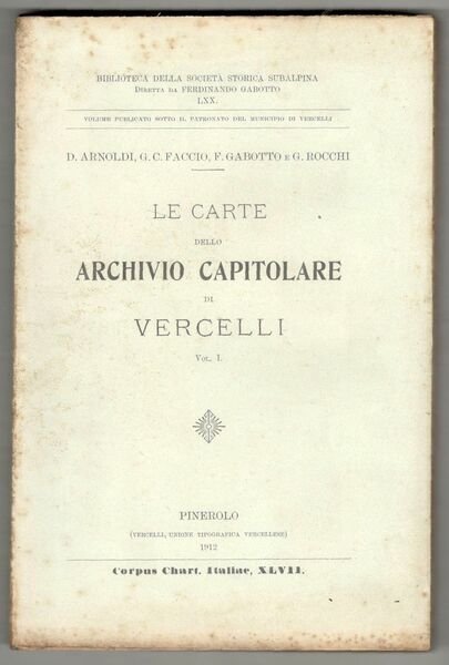 In 8°, pp. VIII, 371, (1). Brossura editoriale. Fioriture alla copertina, per il resto buona copia, interamente a fogli chiusi. Volume pubblicato sotto il patronato del Municipio di Vercelli. Biblioteca della Società Storica Subalpina, LXX. Corpus Chart. Italiae, XLVII.