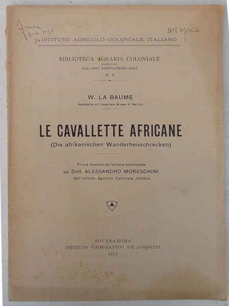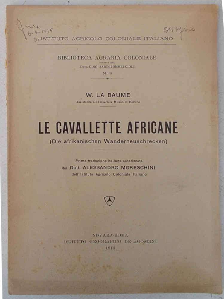 In 8° (cm. 24,5 x 17); pagg. 78; con 4 tavole f.t. ed alcuni disegni n.t.; privo della brossura, ma molto buono e solido. Firma. VG- -. ** Biblioteca Agraria coloniale diretta da G. Bartolommei-Gioli, n. 8.