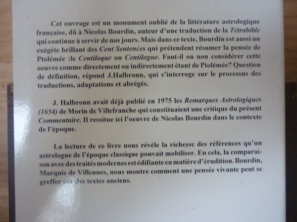 295 - LXXXVIII pp., Réimpression anastaltique de l'édition de 1651 parue chez CARDIN BESONGNE à Paris. En postface: Etudes autour des éditions ptolémaïques de Nicolas de BOURDIN 1640 - 1651) par Jacques HALBRONN. Quelques illustrations n/b. "Bibliotheca Astrologica"