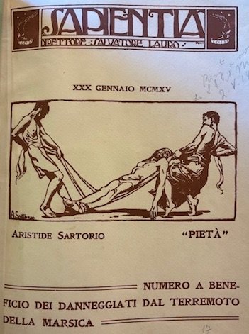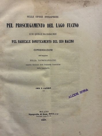 4to (cm. 30), 18 pp. interamente illustrate in bianco e nero (unito) Lombardini Elia, Sulle opere intraprese pel prosciugamento del Lago Fucino e su quelle da eseguirsi pel radicale bonificamento del suo bacino. Considerazioni., Milano, Tipografia di Dom. Salvi e C. 1862, 49(1) pp., 4 pp. Con 2 grandi tavv. più volte ripiegate f.t. (unito) Lampani Gioacchino, Il Lago Fucino e l’Agro romano. Notizie e carte illustrative, Roma, Tipografia Sinimberghi 1881, 2 cc.nn., 28 pp. Con 2 carte topografiche ripiegate f.t., di cui una a colori (unito) Nicolucci Giustiniano, I cranii de’ Marsi. Studio antropolgico, Napoli, Tipografia dell’Accademia Reale delle Scienze 1883, 1 c.nn., 15(1) pp., due tabelle a doppia pagina, 1 c.nn., 2 tavv. f.t. raffiguranti cranii (unito) Sapientia. Rivista mensile di cultura (copertina di Aristide Sartorio). Numero a beneficio dei danneggiati dal terremoto della Marsica, Roma Tipografia Editrice Nazionale 1915, 34 pp. Con 5 tavv. su carta patinata f.t. Legatura ‘900 in mz. tela. Titolo ‘Marsica vol. V’ impresso in nero su tassello al ds. Indice della Raccolta dattiloscritto su una carta inserita ad inizio volume. Brossure editoriali conservate all’interno. Provenienza: Collezione Spina, Avezzano (timbretti ex libris).