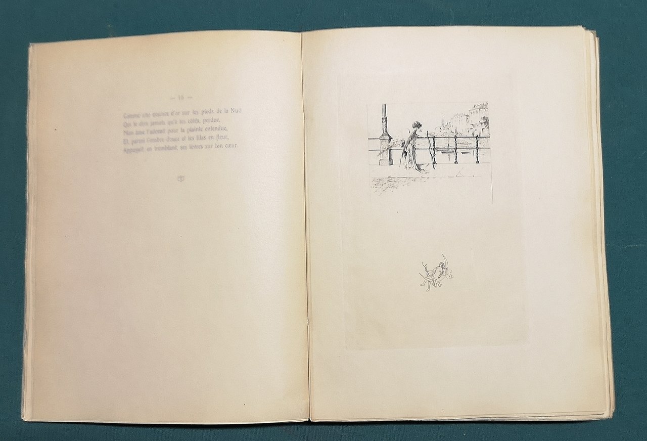 >in-8 grande, pp. 146, con 27 acqueforti originali di Chessa: antiporta, vignetta al titolo, 24 testate ed 1 finalino. Edizione originale, impressa in soli 250 esemplari numerati, il presente (n.25) è uno dei 40 su "gran Japon" in cui le 27 tavole sono presenti in 3 stati, tra cui l'acquaforte pura. Broch. edit. con sovracoperta, fascicolo sciolto di presentazione dell'edizione conservato: pp. 4 (frontespizio, due incisioni di prova e giustificazione della tiratura). Perfetto esemplare.Carlo Chessa (Cagliari 1855-Torino 1912), capostipite di artisti torinesi, si trasferì a Torino nel 1879 dove lavorò come litografo e frequentò l'Accademia Albertina. Artista famoso come illustratore e per i suoi celebri dipinti raffiguranti soggetti di vita alpestre e paesaggi, fu la testa di una dinastia di pittori torinesi del tempo, tra cui il figlio Gigi fu uno dei massimi esponenti dei "Sei di Torino", e il nipote Mauro, vivente, affermato artista contemporaneo. Bénézit III, 570. Comanducci 140-141. Bellini, Pittori Piemontesi dell’800, p. 105. Thieme/Becker VI, p. 470. P.G. Dragone, in Pittori dell'Ottocento in Piemonte, pp. 216/217.