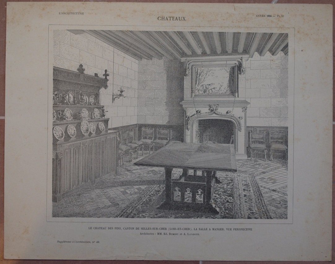 Bella litografia di architettura supplemento de "L'architecture" del 1904. La stampa mostra una sala del Castello des Pins a Selles sur Cher (Loir et Cher). TECNICA: Litografia DIMENSIONI FOGLIO: cm 27,5X35 DIMENSIONI INCISIONE: cm 21x26 EPOCA: 1904 CONDIZIONI: Buone condizioni. Fioriture e strappi marginali. Beautiful lythography of 1904 taken from the work "L'architecture" of 1904. The print represents a room in Castle des Pins Canton de selles sur Cher (Loir et Cher). TECHNIQUE: Lythography PAGE SIZE: cm 27,5X35 PRINT'S SIZE: cm 21x26 PERIOD: 1904 CONDITION: good conditions. Foxings