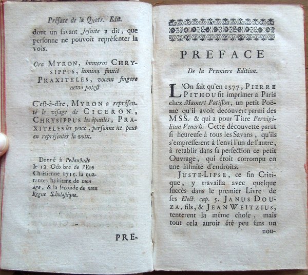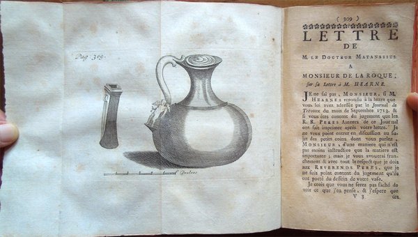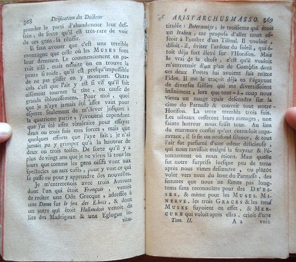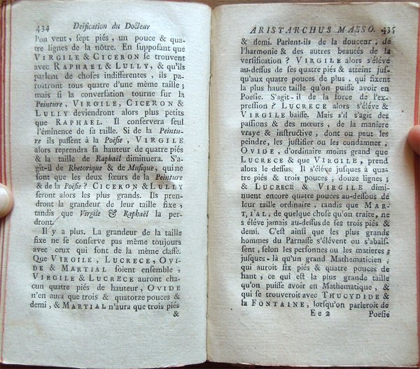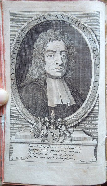 Due tomi in un volume in-16° (16,3 x 9,7 cm), pp. (68), 264; da 265 a 528, (20), legatura coeva in mezza pergamena e angoli, con titoli manoscritti al dorso. Normali tracce d'uso e del tempo alla legatura, in particolare, abrasioni ai piatti e ai labbri dei piatti, e piccoli lavori di tarlo al dorso. Tagli rossi. In antiporta, ritratto di Chrisostome Matanasius, inciso su rame. I tomi contengono 3 tavole fuori testo: le 2 al primo tomo ospitano la prima il ritratto di Judith Beseraige (un po' rifilata nel margine esterno, con una piccola mancanza nella parte inferiore sempre del margine esterno), la seconda, più volte ripiegata, uno spartito musicale; la tavola al tomo secondo, anch'essa più volte ripiegata, raffigura un antico vaso. Piccolo restauro nel margine esterno della tavola con il ritratto del Matanasius; ai fogli che ospitano le pagine 263-264 e le ultime due non numerate del tomo secondo, piccolo lavoro di tarlo, restaurato, con integrazione, a matita, di poche lettere mancanti. Normali, leggere arrossature ad alcune pagine; per il resto, esemplare ben conservato. Titolo completo: Le chef-d'oeuvre d'un inconnu, pöeme heureusement découvert et mis au jour, avec des Remarques savantes et recherchées, par M. le Docteur Chrisostome Matanasius. On trouve de plus une dissertation sur Homere et sur Chapelain, deux lettres sur des antiques, la Préface, de Cervantes sur l'Histoire de D. Quixotte de la Manche, la Déification d'Aristarchus Masso, et plusieurs autres choses non moins agréables qu'instructives. Neuvieme edition.