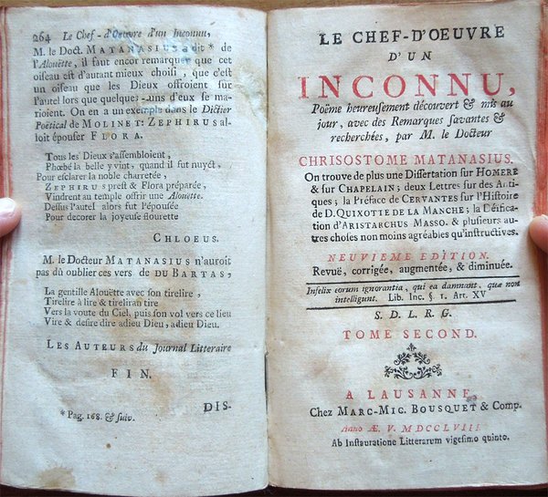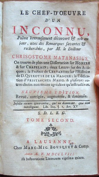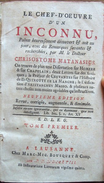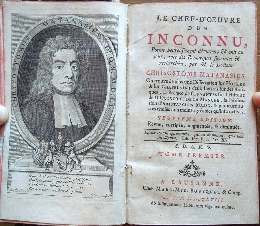 Le chef-d'oeuvre d'un inconnu, pöeme heureusement découvert et mis au jour, avec des Remarques savantes et recherchées, par M. le Docteur Chrisostome Matanasius. On trouve de plus une dissertation sur Homere . Neuvieme edition