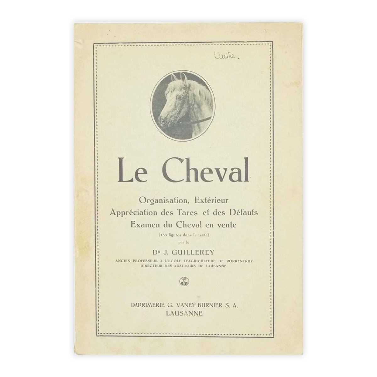 Autore: Dr J Guillerey Titolo: Le Chevale Sottotitolo: Organisation, Exterieur - Appreciation des Tares et des Defauts - Examen du Cheval en vente (133 figures dans le texte) Edizione: Imprimerie G. Vaney-Burnier, Lausanne 1927 Dimensioni: 23x15 cm Pagine: 194 Copertina: Brossura Condizioni: Buone