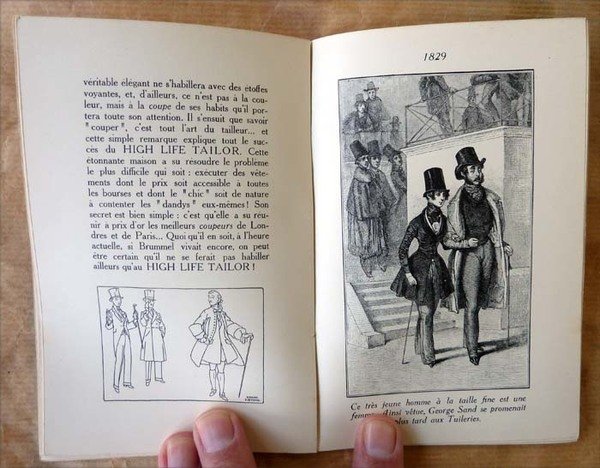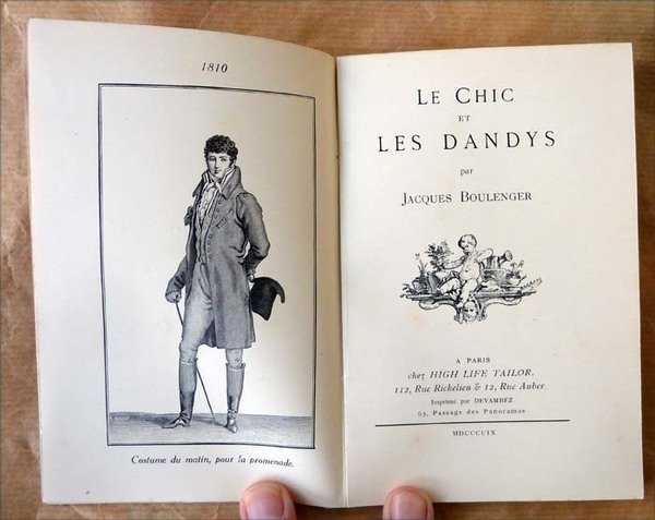 Un volume broché de dimensions 10x16 cm; de 38 pp. sur vélin ivoire; 17 compositions pleine pages représentant des "Dandy's" de 1810 à 1845 en fin quelques présentations de costumes proposés par High Life Taylor en 1909. Charmante couverture rempliée et coloriée en papier parcheminé. Rare catalogue publicitaire dont les illustrations sont parfois attribuées à Boutet de Monvel. Quelques rares et pâles rousseurs. Voir les photos.