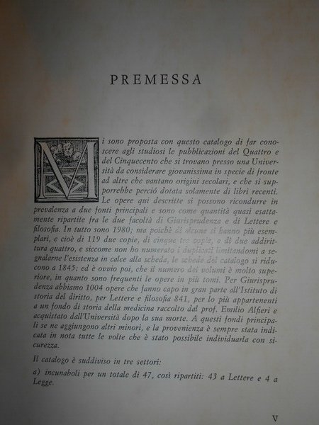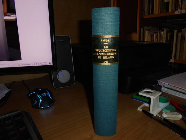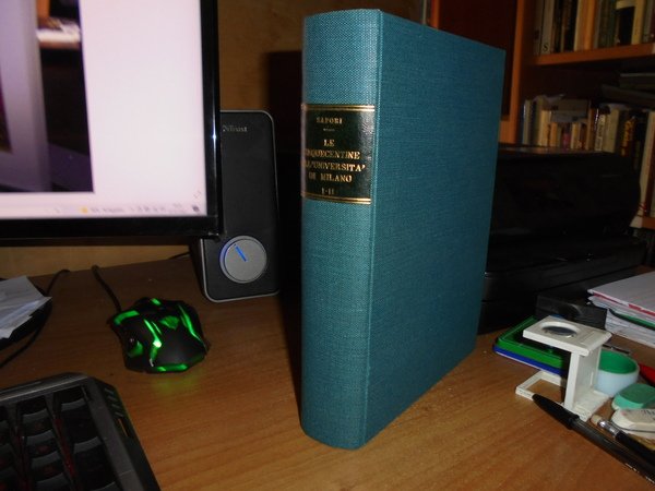 GIULIANA SAPORI. Milano, Stabilimento Tipografico Antonio Cordani, 1969. LE CINQUECENTINE DELL'UNIVERSITÀ DI MILANO. 2 volumi legati assieme in-8°, tela verde con titolo in oro entro tassello al dorso. Vol. I. Dal 1501 al 1550 Precede un elenco degli incunaboli. xv, 172, (3) pp. di addenda; Vol. II. Dal 1551 al 1599. 414 pp. entrambi i volumi con varie illustrazioni in bianco e nero nel testo (qualcuna anche fuori testo.). Ottimo esemplare. Uff. A - II - 6