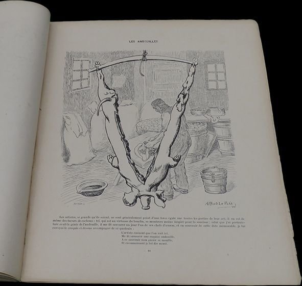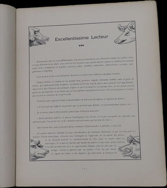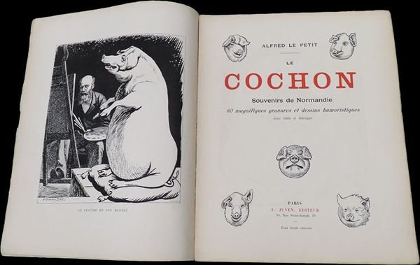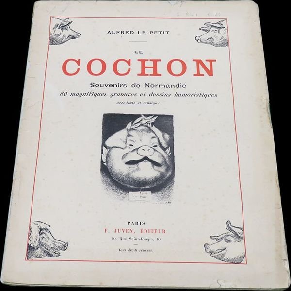 In folio (35,2x28 cm); 93, (3) pp. Brossura editoriale. Rinforzo al dorso ad integrare p erdita di carta, piccoli strappetti ai piatti e per il resto, allinterno, esemplare in buone-ottime condizioni di conservazione. Prima, rara edizione, di questa celebre opera caricaturale dedicata al maiale, ai suoi utilizzi in cucina ed al suo allevamento nella Normandia della fine dellottocento, opera del celebre fotografo, pittore e caricaturista francese, Alfred Le Petit (1841-1909). Dopo aver studiato disegno, pittura e fotografia, Alfred iniziò a disegnare a Rouen, poi a Parigi, contribuendo alle due famose riviste illustrate ottocentesche La Lune e LÉclipse. Nel 1870 fondò La Charge, un periodico che attaccò Napoleone III con ferocia. Successivamente fondò anche le testate polemiche Le Pétard e Le Sans-Culotte, anch'esse incent rate sul commento e la satira politico dei detentori del potere. Come ebbe modo di provare sulla sua pelle, il commento politico può essere costoso, tanto che Le Pitit finì la sua vita in condizioni di estrema povertà, dopo essere estromesso dalle principale testate giornalistiche e venir boicottato da alcuni nemici che si era fatto, grazie ai suoi scritti. Finì i suoi giorni facendo caricature per i turisti al primo piano della Torre Eiffel e cantando in cabaret, accompagnandosi col violino del quale era un abile suonatore. Si legge nellintroduzione dellopera: « A moins que vous ne soyez Mahométan, vous avez certainement plus d'une fois mangé du cochon ; mais en vous délectant de sa chair, vous est-il arrivé de penser par quelle odyssée a passé ce malheureux animal avant d'être transformé en boudins, saucisses, pâtés, jambons, andouilles, andouillettes, cervelas, salé, galantine et chip olata. C'est de quoi je vais vous entretenir, heureux si je puis vous intéresser quelques instants. D'après Buffon, le cochon est un animal brut, grossier, stupide, immonde, hébété ; mais le génie de Buffon, qui embrassait toute la nature, lui faisait écrire sur trop de choses pour pouvoir tout approfondir. Aussi a-t-il fait l'histoire des animaux d'après ce qu'il en avait lu ou entendu dire, ne les ayan t souvent guère vus qu'empaillés ; il en résulte que ses descriptions sont pleines d'erreurs. Tel est le cas pour le cochon, qui est juste le contraire de ce qu'il en dit. Voici du reste ce qu'on lit dans le Dictionnaire de Larousse en réponse à l'opinion de Buffon: « Il ne serait pas difficile d e prouver que ce portrait peu flatteur est souverainement injuste, etc. Je lis encore dans le Dictionnaire pittoresque d'histoire naturelle: « Selon quelques auteurs, le porc a l'intelligence très bornée ; il est peu susceptible de répondre aux attentions que l'on a pour lui, et de s'attacher aux personnes qui lui font du bien. ». Rara opera caricaturale dedicata ai maiali. Raro. Rare first edition.