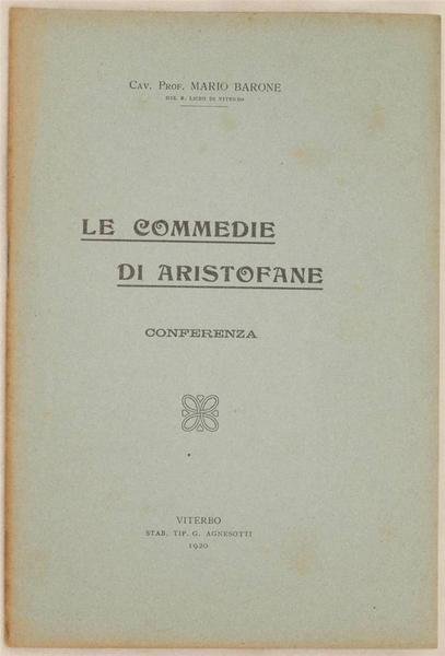In 8. Dim. 24x16 cm. Pp. 32.Interessante pubblicazione del 1920 del Cav. Prof. Mario Barone del Regio Liceo di Viterbo. Si tratta di una conferenza sulle commedie di Aristofane. In ottime condizioni. Copertina editoriale in ottime condizioni generali con lievi usure ai margini e dorso. Legatura in ottime condizioni. All'interno le pagine si presentano in ottime condizioni con rare fioriture. Interesting pamphlet of 1920 by the Cav. Prof. Mario Barone of the high school in Viterbo. It is a conference about the plays of Aristofane. In very good conditions. Editorial cover in very good general conditions slightly worn in the edges and spine. Binding in very good conditions. Inside pages are in very good conditions with occasional foxings.