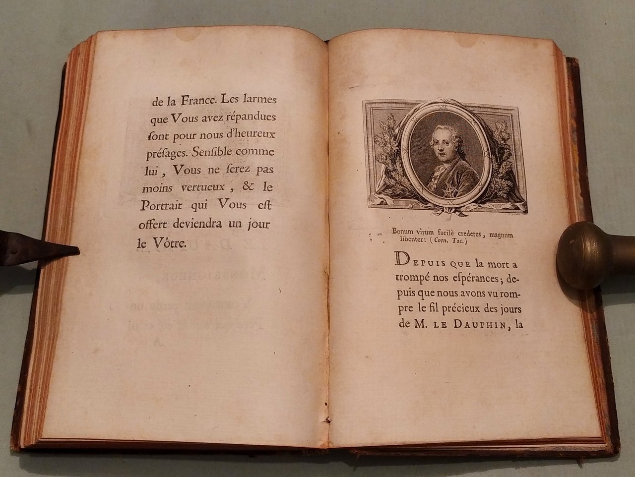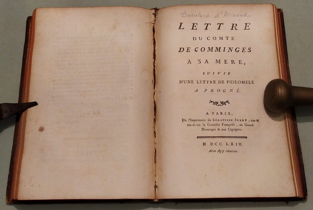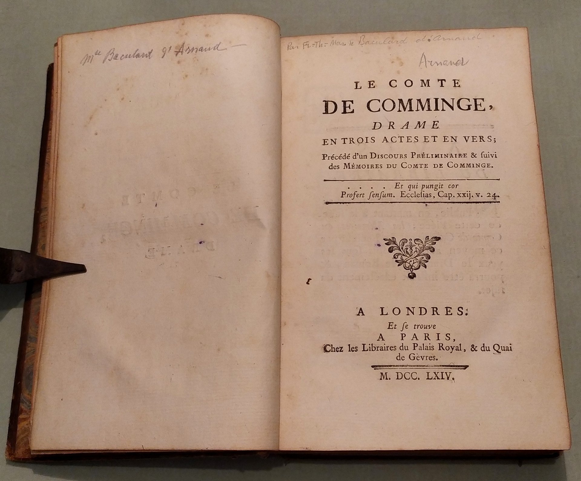 ARNAUD François d'. Le comte de Comminge drame en trois actes et en vers; précédé d'un discours préliminaire et suivi des Mémories du Comte de Comminge. A Londres et se trouve à Paris, 1764. Pp.16, 215. 1 planche. Unito: idem. Lettre du Comte de Comminges a sa mere, suivie d'une lettre de Philomele a Progné. A Paris, Jorry, 1764. Pp. 68. 2 planches, 2 vignette, 2 culs de lampe di Eisen, incisi da De Longueil. Unito: LA VALLIERE. Les infortunés amours du Comte de Cominge. A Paris, Jay, 1765. Pp.12. Il testo in corsivo ed 1 pagina con musica. Unito: ARNAUD. Portrait de Feu Monseigneur le Dauphin. Paris, Lottin, 1766. Pp.39. Frontespizio e cul de lampe di Cochin incisi da Migger. 2 eleganti vignette raffiguranti il Delfino da bambino e da adulto di Lampereur. Ampi margini. Edizione su carta grande d'Olanda in 8vo. Legatura in bazzana coeva, dorso a cordoni con tassello, ricchi fregi in oro. Raccolta di piéces in versi ed in prosa. Cohen 100, per altra edizione.