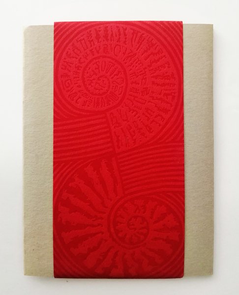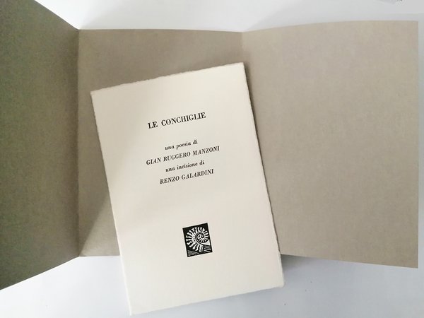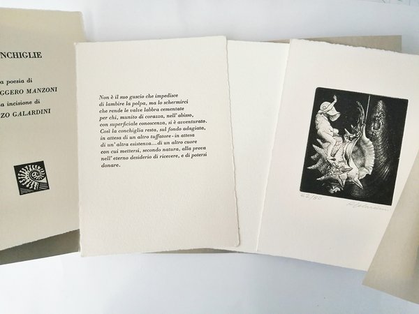 cartellina con fascetta in cartoncino. Tre ante formato 17,5x13,5 contenente 4 fogli sciolti in carta a mano Hahne Muhle e Fabriano. Edizione fuori commercio tirata al torchio in 110 esemplari. Con una incisione firmata e numerata (62/80) da Renzo Galardini. Bella copia