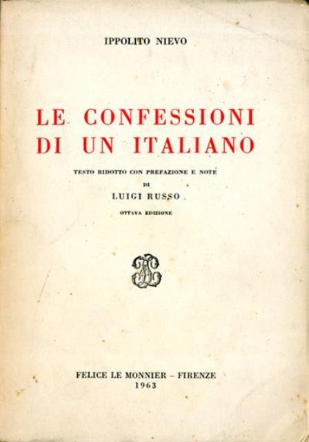 8. ed. XVI, 342 p. ; 20 x 14 cm. La storia di Carlino, dell'educazione di una sensibilità e di una coscienza attraverso la vita; la storia di una nazione, del suo riscatto politico; la storia di un'epoca, drammatica e contraddittoria, di transizione. Dall'intreccio di questa triplice prospettiva scaturisce uno dei romanzi più suggestivi dell'Ottocento italiano, una sorta di poema della fanciullezza, narrato con tanta trepidazione di sentimento, freschezza, ironia e generosità di rimpianto, che fa spuntare la certezza di un risveglio vicino, del prossimo risorgere di un popolo, di una nazione. Testo ridotto con prefazione e note di Luigi Russo. Brossura editoriale, coperta in cartoncino flessibile, segni del tempo ai risvolti della coperta, ai tagli e alle pagine interne (ingiallimento della carta e fioriture), per il resto libro integro. Codice libreria 8080.