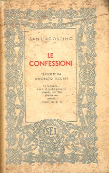 4. ed. corretta. XL, 591 p., [1! c. di tav. ; 15 x 9 cm. Le «Confessioni» è un'opera autobiografica in XIII libri di Agostino d'Ippona, padre della Chiesa, scritta nel 398 d. C. È unanimemente ritenuta tra i massimi capolavori della letteratura cristiana. In essa, Sant'Agostino, rivolgendosi a Dio, narra la sua vita e in particolare la storia della sua conversione al Cristianesimo. Titolo originale dell'opera: «Confessiones». Tradotte da Onorato Tescari. Legatura editoriale, coperta in pergamino rigido, illustrata con motivi grafici di colore verde, titolo impresso in rosso al piatto e al dorso. Qualche segno del tempo alla coperta e alle pagine interne (ingiallimento) per il resto esemplare in buono stato. Codice libreria 3729.