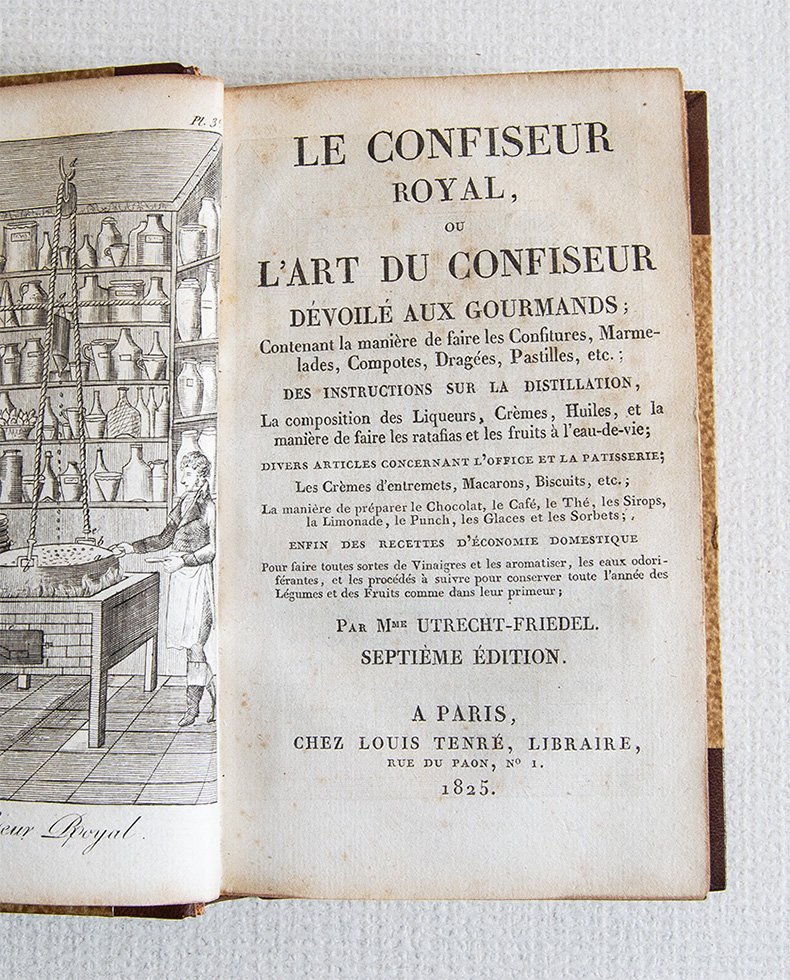 Le confiseur royal, ou l’art du confiseur dévolé aux gourmands; Contenant la manière de faire les confitures, marmelades, compotes, dragées, pastilles, etc.; des instructions sur la distillation, La composition des liqueurs, crèmes, huiles, et la manière de faire les ratafias et les fruits è l’eau-de-vie; divers articles concernant l’office et la patisserie...