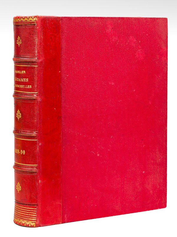 1 vol. in-folio reliure demi-chagrin rouge, dos à 4 nerfs dorés, Le Conseiller des Dames et des Demoiselles, Année 1889-1890 complète (Du 6 octobre 1889 au 28 septembre 1890), 833 pp. et 2 f. avec 31 planches hors texte en couleurs (dont une dépliante) Bon exemplaire, avec 31 belles planches en couleurs (qq. rouss., lég. frott. en reliure, avec la table du premier semestre). La revue mensuelle "Le Conseiller des Dames" parut de 1847 à juin 1892. Il s'agissait d'un mensuel à destination d'un lectorat bourgeois, qui seul pouvait s'offrir un abonnement à une telle revue (un abonnement annuel à une telle revue représentait près de 10 jours de revenu d'un ouvrier de l'époque). Son contenu cherchait à joindre l'utile à l'agréable, et souhaitait couvrir l'ensemble des préoccupations de ses lectrices. Peu courant, particulièrement dans ses toutes dernières années, avec 31 planches en couleurs.