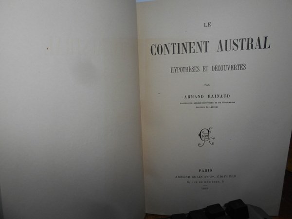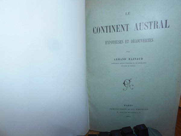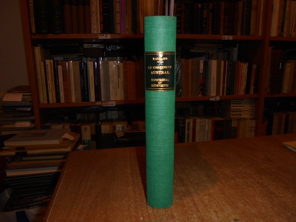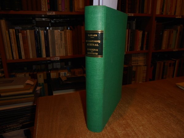 par ARMAND RAINAUD. Paris, Armand Colin et Cie éditeurs, 1893. Le CONTINENT AUSTRAL Hipothèses Découvertes. In-8° grande, tela verde con titolo in oro entro tassello al dorso, copertine originali conservate. (iv), 490, (1) pp. Perfetto esemplare in legatura artigianale anni '60 con le brossure originali conservate. B - II - 4