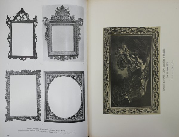 In-4 gr., mz. tela editoriale (spacchi a una cerniera interna), pp. 45,(3), con una illustrazione in bianco e nero applicata alla pagina (insegna dell'arte degli intagliatori) ed una importante raccolta di 364 tipi di cornici, in 160 tavole in bianco e nero fuori testo, realizzate da valenti artigiani veneziani dal Trecento al Settecento. Ben conservato.