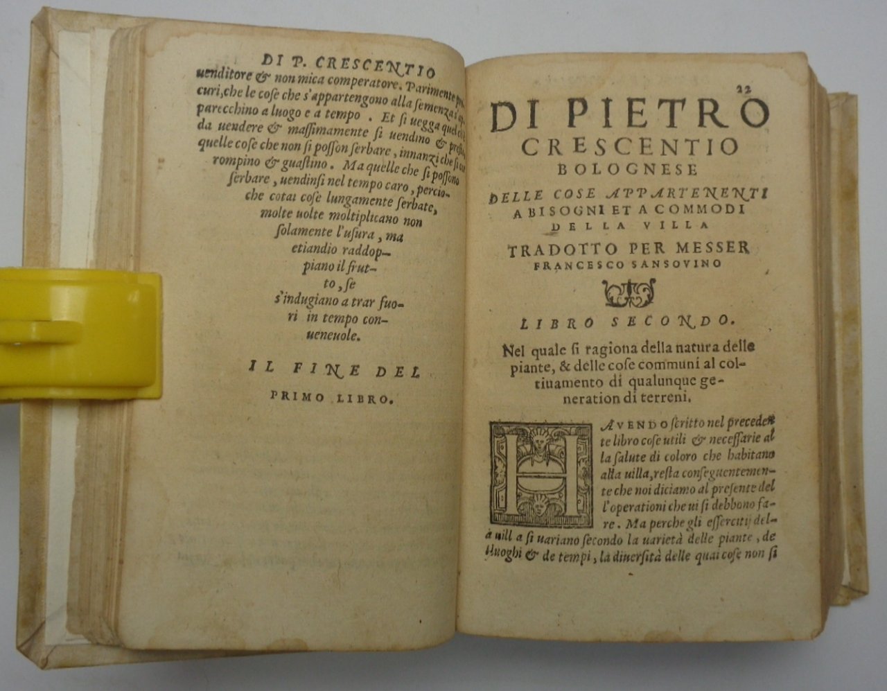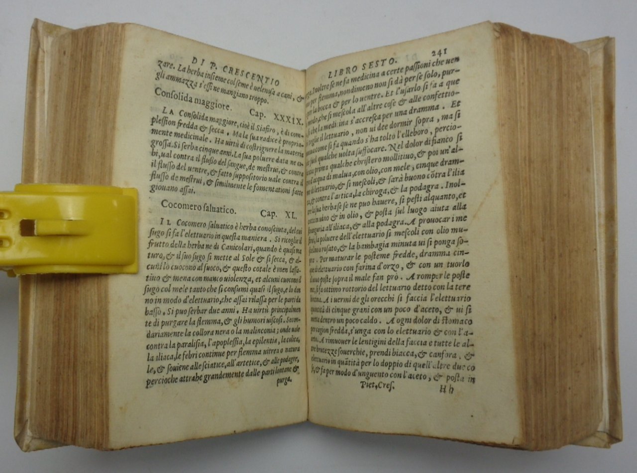 Titolo completo: "Pietro Crescentio tradotto novamente per M. Francesco Sansovino nel quale si trattano le cose della villa con le figure delle herbe poste nel fine. Con un vocabolario delle voci difficili che sono in questa opera, & con i disegni de gli stromenti co quali si cultiva & si lavora la terra". Un volume (10x16x6 cm) di 8 carte non numerate, 481 (ma correttamente 479 a causa di errori di numerazione) carte numerate, con 22 tavole incise in legno a piena pagina. Legatura in piena pergamena moderna (con stile antico) con dorso liscio muto. Ordinarie tracce del tempo e qualche brunitura, vecchia firma di possesso al frontespizio ma nel complesso ottimo esemplare. L'Opus Ruralium Commodorum di Pietro Crescenzi, bolognese (1233-1320) viene considerato il più importante trattato di agronomia medievale. Per dichiarazione dello stesso autore il testo si basa su tre tipi di fonti: autori antichi, moderni, ed esperienza personale. L'opera viene destinata ad un pubblico socialmente ben definito nell'Italia del 300: quello della borghesia che aveva costruito un patrimonio nel contado (villa). Il suo carattere di enciclopedia pratica ne assicurò il successo, fino alla fine del secolo XVI. Questa del 1564 è una delle edizioni più apprezzate ed accurate, nella traduzione e cura del Sansovino, che aveva notato come le stampe precedenti fossero spesso mal tradotte fino a rendere incomprensibili interi passaggi del testo L'opera è divisa in 12 capitoli che affrontano tutti i diversi aspetti della buona conduzione di una "villa": dalla qualità delle terre alle coltivazioni, dalle erbe agli animali. Un intero capitolo viene tra l'altro dedicato alla coltivazione della vite e al vino. Le figure xilografiche rappresentano fiori, frutti e strumenti per il lavoro agricolo.