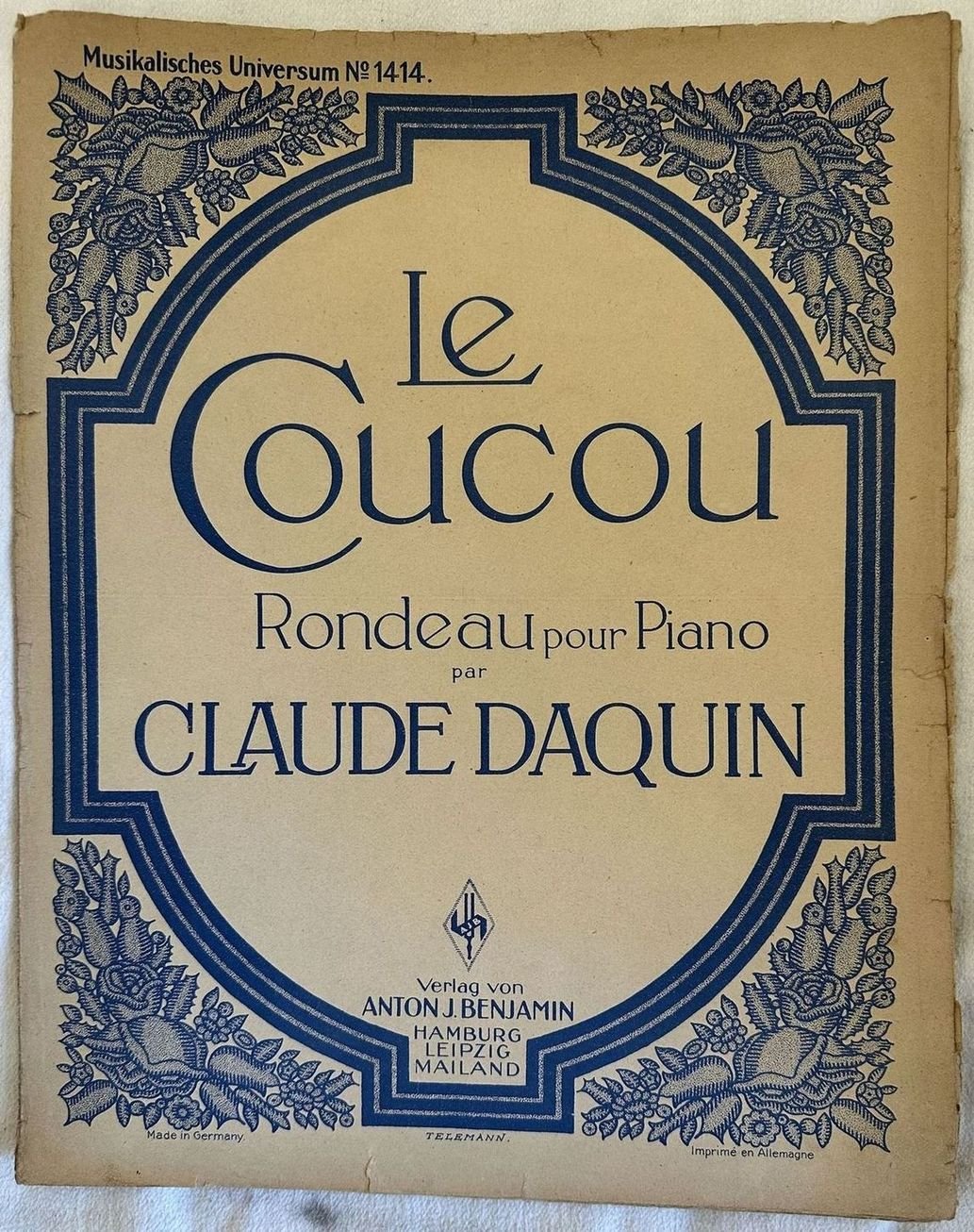 Edizione di inizio novecento della melodia "Le coucou" di Claude Daquin (1694-1772) rivisto a cura di Anton J. Benjamin. In buone condizioni. Copertina editoriale in discrete condizioni con lievi usure marginali. Strappi marginali. Legatura editorialmente assente. Pagine in buone condizioni con rare fioriture. Strappi marginali. In Folio. cm. 34x27. Pp. 5.Edition of early 20th century of the melody "Le coucou" by Claude Daquin (1694-1772) reviewed by Anton J. Benjamin. In good conditions. Editorial cover in fair conditions lightly worn in the extremities. Tears in the edges. Binding in editoriarly missing. Pages in good conditions with occasional foxing. Tears in the edges. In Folio. cm. 34x27. Pp. 5.<BR><BR>