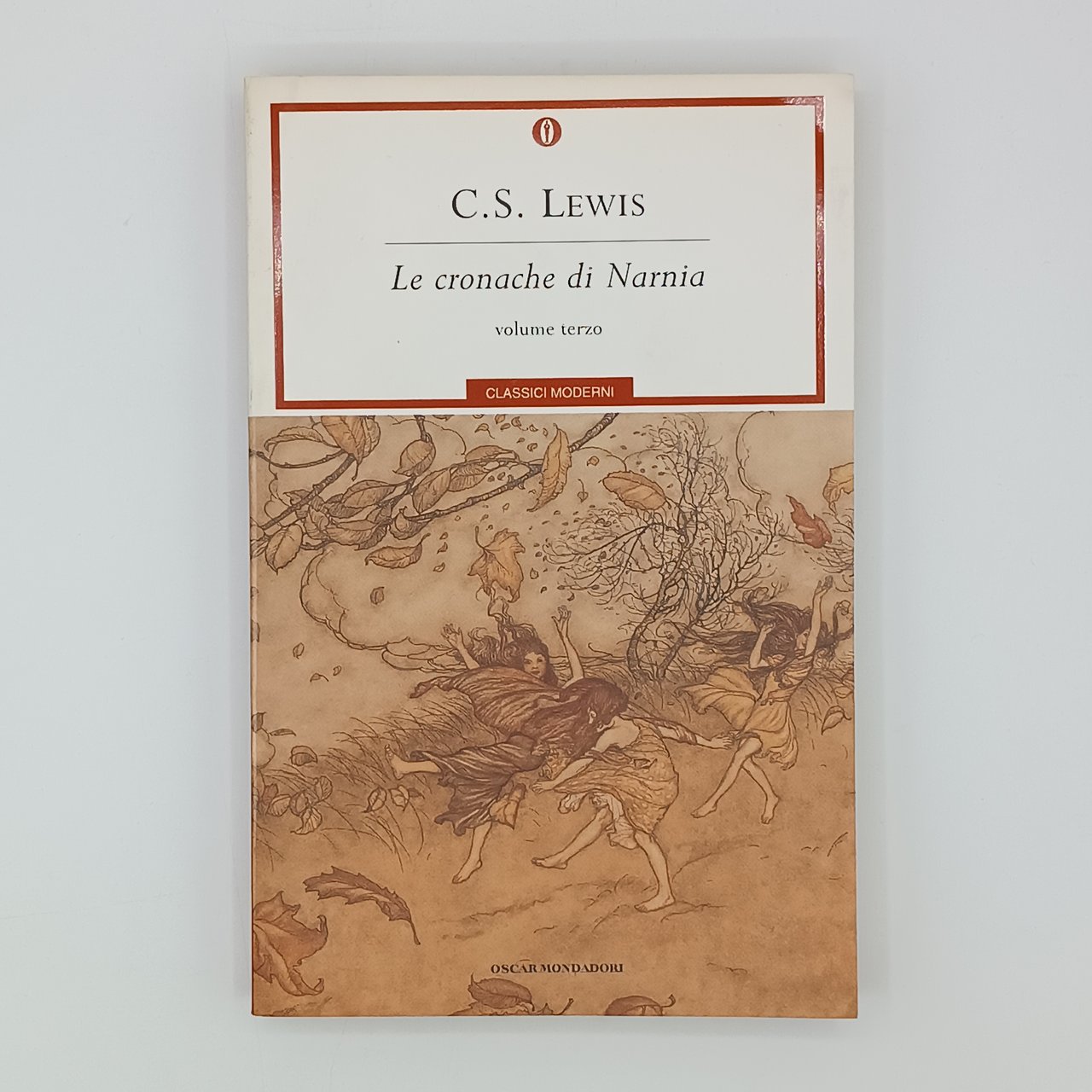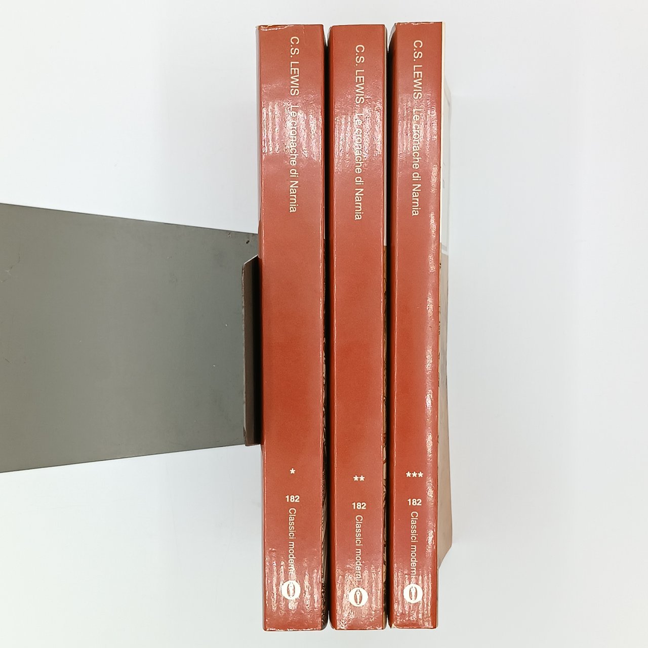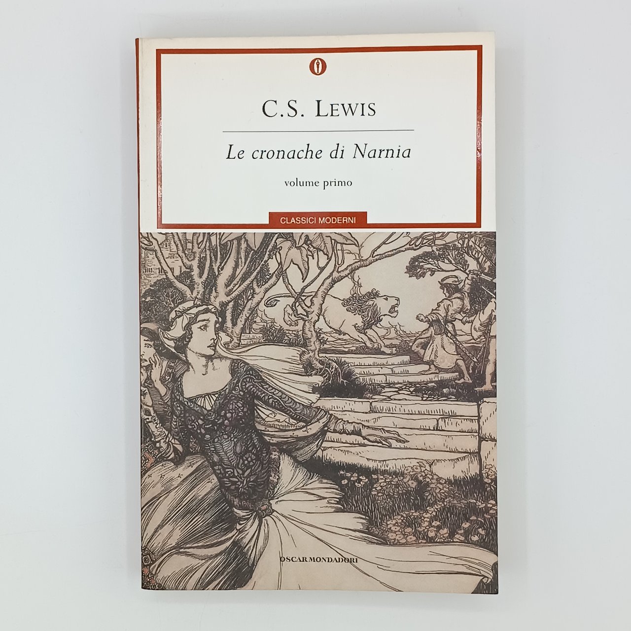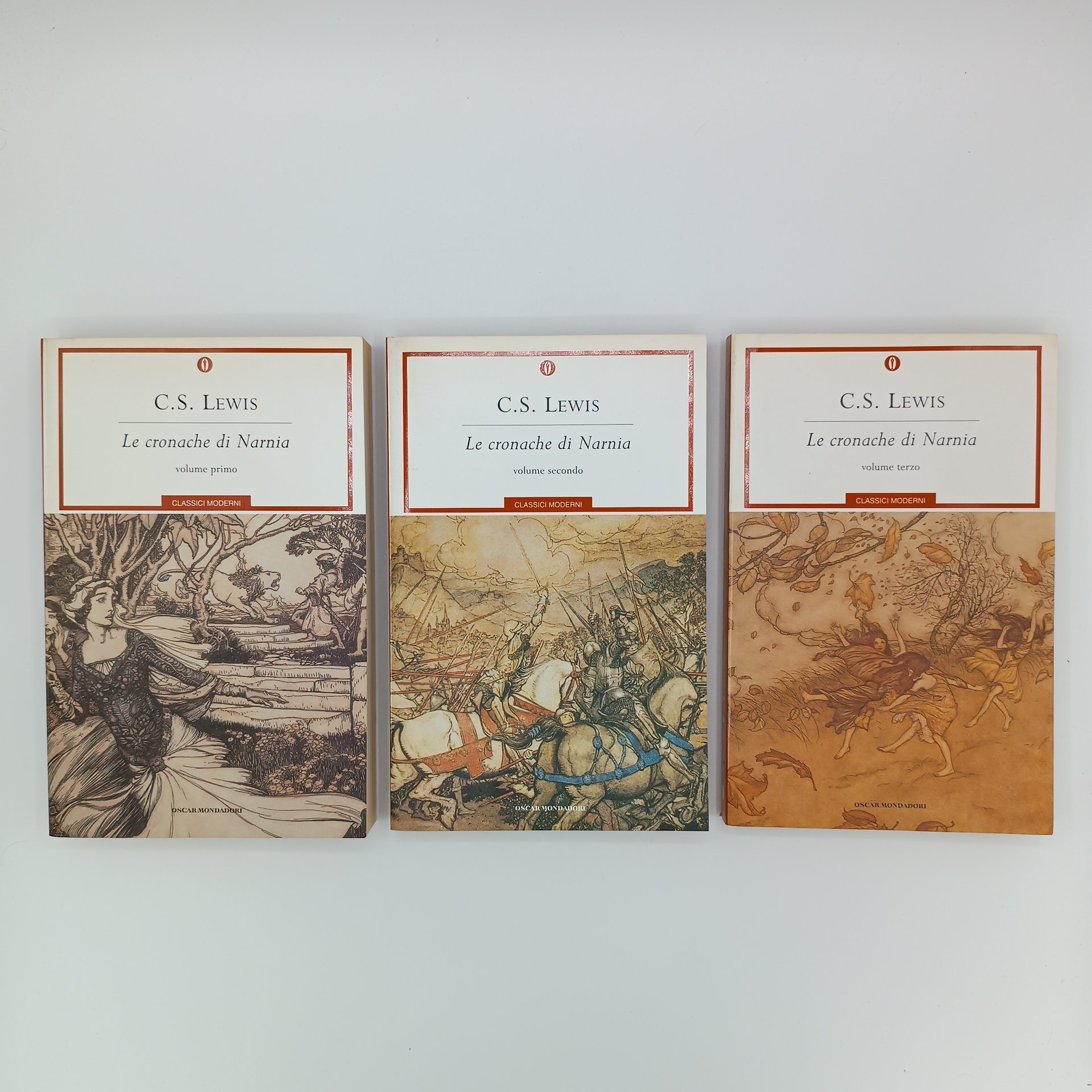 La trilogia de "Le cronache di Narnia" in prima edizione nella collana "Oscar Classici Moderni". Lieve brunitura sui tagli. Copie in ottime condizioni.