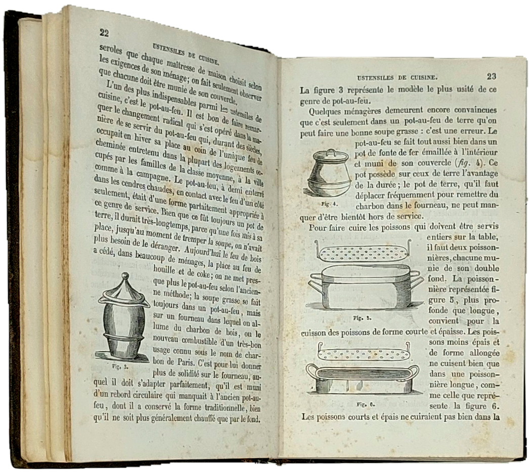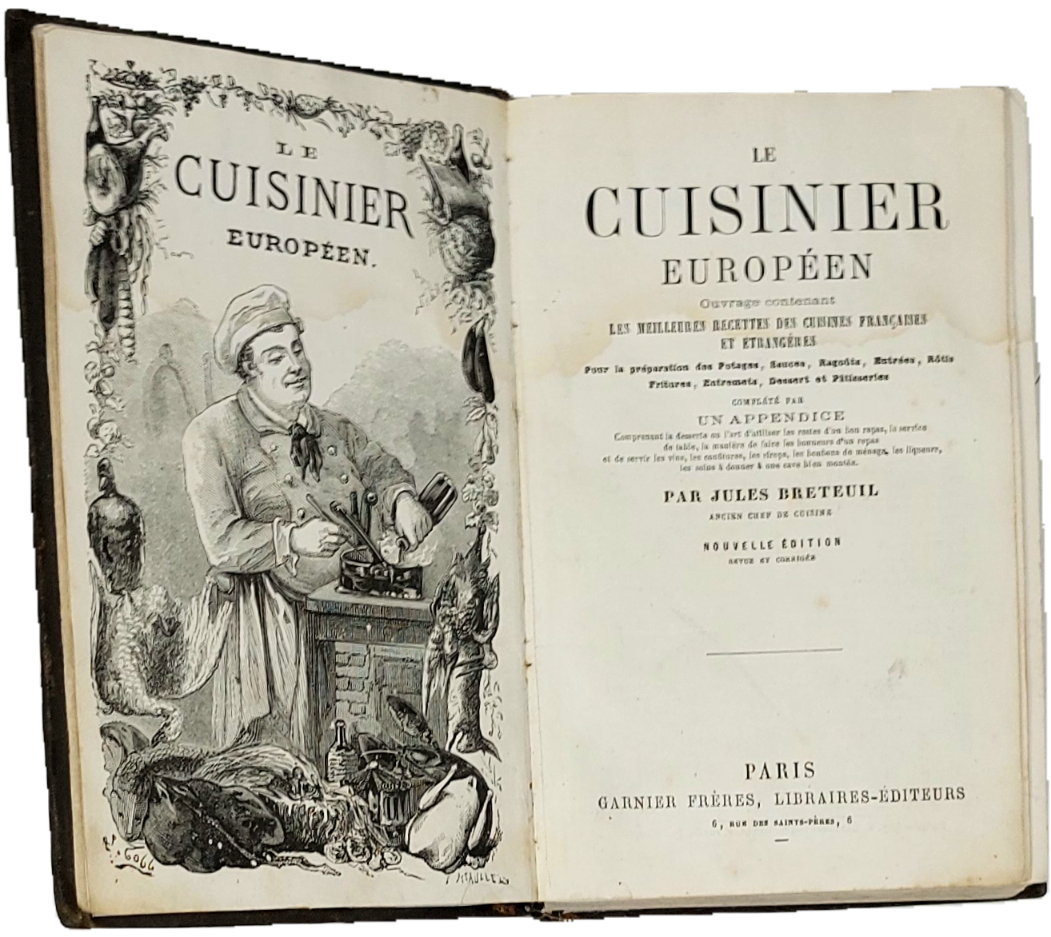 >in-16, pp. VIII, 748, bell'antiporta fig. e 188 fig. silografate n.t. Legatura coeva in m. pelle, dorso a nervi con titolo e fregi in oro. Una delle prime edizioni (dal 1860) di un vasto classico testo di gastronomia dell'ottocento ad opera di J. Breteuil "ancien chef de cuisine". Esteso ad ogni aspetto dell'arte della tavola in Francia e in Europa. Buon esemplare, lievissimi aloni marginali. Bitting, Gastronomic Bibl., p.58. Vicaire, 114.