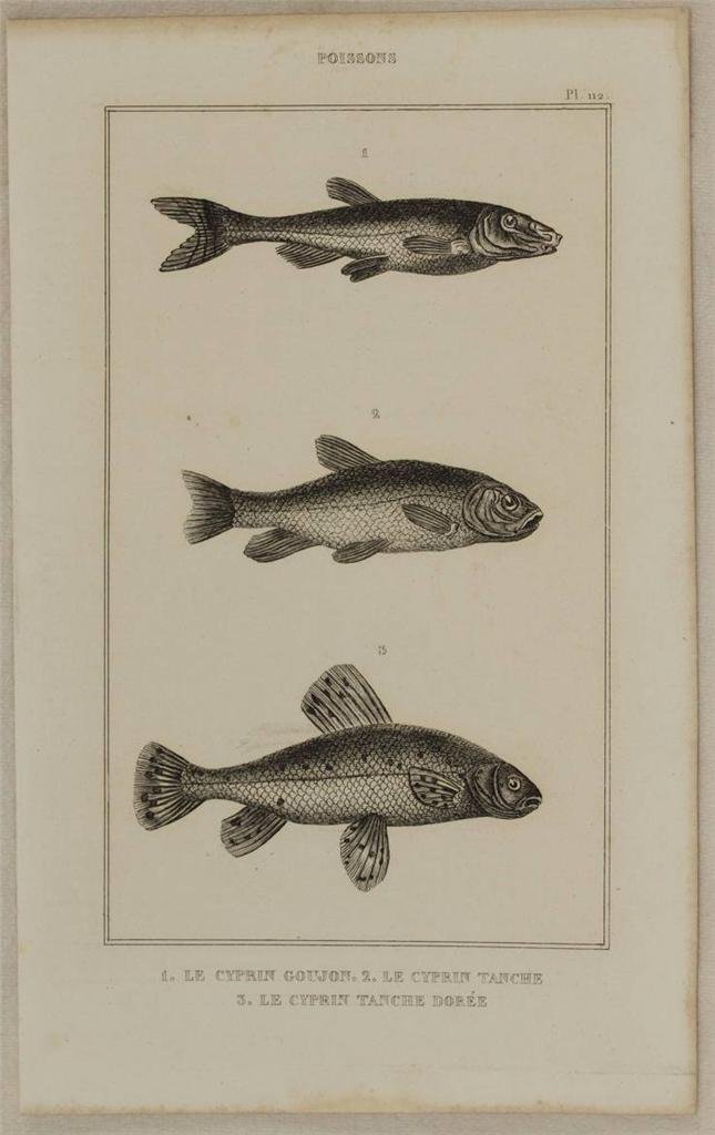 Bella incisione probabilmente della metà del XIX secolo tratta dalla monumentale opera di storia naturale di Buffon, carta spessa. L'incisione rappresenta tra specie di cyprinus, carpe. In buone condizioni, fioriture. Usure al margine sinistro. TECNICA: Incisione DIMENSIONI FOGLIO: cm 20x12,5 DIMENSIONI INCISIONE: cm 14x9 EPOCA: 1850 circa Buffon fu un'esponente del movimento scientifico legato all'illuminismo e le sue teorie influenzarono le generazioni successive di naturalisti in particolare Jean Baptiste Lamarck e Charles Darwin. Questa è la sua opera più celebre ed è l'"Histoire Naturelle" pubblicata per la prima volta tra il 1749 ed il 1789 in 36 volumi di cui 8 postumi grazie al lavoro di Bernard Lacepede. Buffon espone tutto il sapere dell'epoca nel campo delle scienze naturali e proprio in questo scritto rilevò le somiglianze tra l'uomo e la scimmia e la possibilità di una genealogia comune. Nice engraving of probably half of the XIX century, taken from the monumental work of natural history by Buffon, wide paper. The engraving represents three species of cyprinus fish, carps. In good conditions, foxings. Wearings in the left edge. TECHNIQUE: Print LEAF SIZE: cm 20x12,5 PRINT'S SIZE: cm 14x9 PERIOD: 1850 circa Buffon was an exponent of the scientific movement connected to illuminism and his theories inspired the next generations of naturalists in particular Jean Baptiste Lamarck and Charles Darwin. His most famous work is l'"Histoire Naturelle" published for the first time between 1749 and 1789 in 36 volumes of which 8 are posthumous thanks to the work of Bernard Lacepede. Buffon exposes in the work all the notions in natural history and in this writing in particular underlined the similarity between monkeys and man with a possibility of common genealogy.