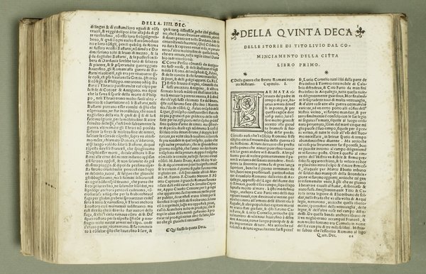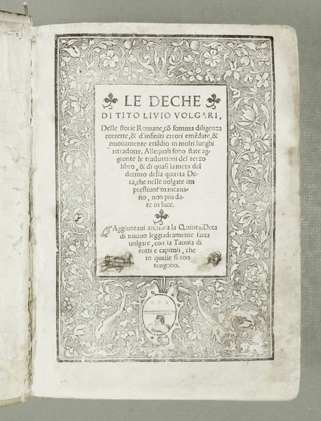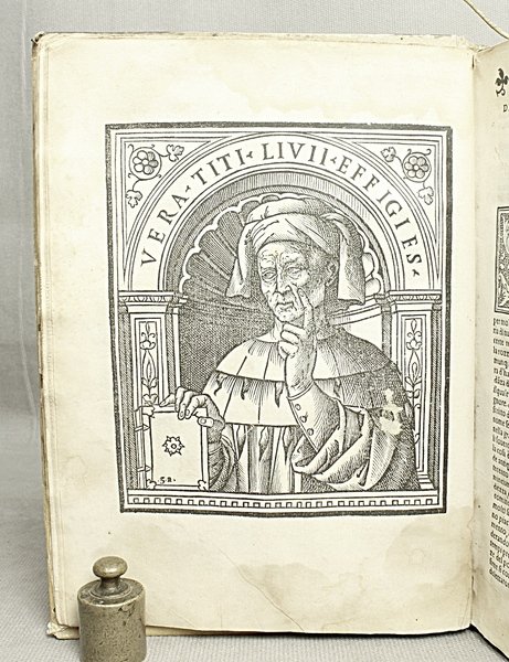 In-4ø; 20, 528, 72 carte; legatura del tempo in tutta pergamena, . Qualche gora e macchia per lo pi— marginali. Importante volgarizzamento delle storie in quanto contiene per la prima volta la traduzione della quinta deca. Il volume si apre con un titolo circondato da una larga bordura xilografica di fine esecuzione ed Š ornato da un'altra xilografia a piena pagina con il ritratto dello storico latino, opera di un valente artista. Gamba 600. Paitoni II pp. 209-210.