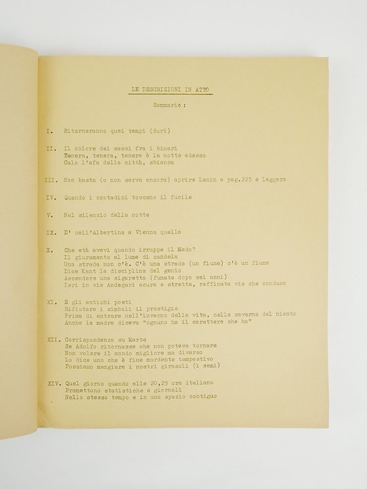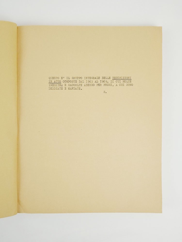 LIBROEdizione originale.CON AUTOGRAFO.Ottimo esemplare (minima mancanza al piede del dorso) pregiato da dedica dell’autore al lato interno del piatto anteriore: «da Roversi -- marzo ‘70».Dopo l’ultima raccolta poetica pubblicata con un grande editore - «Dopo Campoformio», uscita per Einaudi in seconda edizione rivista nel 1965 -, Roberto Roversi decise di affidare i propri scritti a volumi autoprodotti e autonomamente distribuiti. Una scelta politica libertaria, votata a quell’autentico amore per la cultura che del resto già informava la storica Libreria Antiquaria Palmaverde fondata dal poeta e scrittore con la moglie Elena Marcone nel 1948. Tra queste autoproduzioni, un posto particolare deve essere riconosciuto a «Le descrizioni in atto (1963-1969)», vero manifesto poetico e insieme politico e civile del creatore – con Pasolini e Leonetti – della rivista «Officina», nonché primo frutto importante del suo affrancamento dell’editoria ufficiale (nonostante le pressioni di Calvino affinché l’opera venisse pubblicata con Einaudi). Raccolta composta da quarantasei “descrizioni” composte tra il 1963 e il 1969, essa rappresenta un passaggio – costituito da frammenti di realtà posti in sequenza – all’interno della società neocapitalista per disvelarne meccanismi e miserie. Un’opera «dedicata e mandata a pochi» - come scritto dallo stesso Roversi nelle scarne righe introduttive –, apparsa nel dicembre 1969 nella prima tiratura qui presentata e poi riproposta in quattro tirature successive – sempre stampate e diffuse in proprio dall’autore – nell’arco di oltre vent’anni. Ma più che di tirature si dovrebbe, in verità, parlare di nuova edizione, in special modo per la “quarta tiratura” uscita nel marzo 1990. Dopo gli esemplari ciclostilati del 1970 e del 1985, infatti, «Le Descrizioni» del 1990 furono licenziate in una versione a stampa «un poco riveduta e con aggiunte» come prima uscita della collana «Quaderni de Lo spartivento», chiaramente legata al foglio roversiano di “poesia militante” «Lo Spartivento».