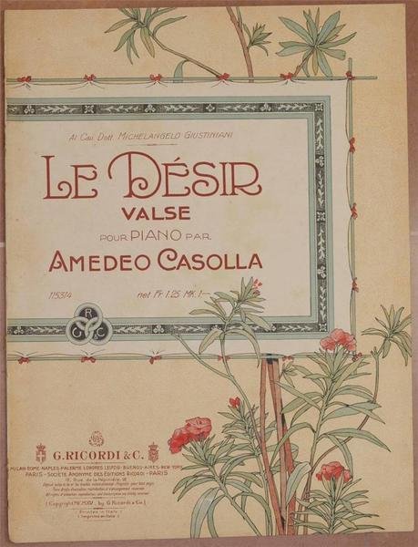 Formato cm. 33x25. Pp. 4. Bello spartito del 1915 della melodia valzer "Le desir" per pianoforte. Musica di Amedeo Casolla. In ottime condizioni con rare fioriture e usure al dorso. Beautiful musical score of 1915 of the waltz melody "Le desir" for piano. Music by Amedeo Casolla. In good conditions with occasional foxings, wearings and tears in the spine.<BR>
