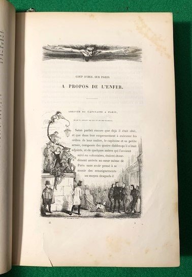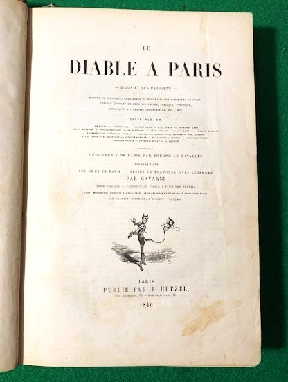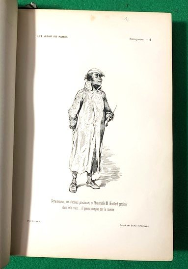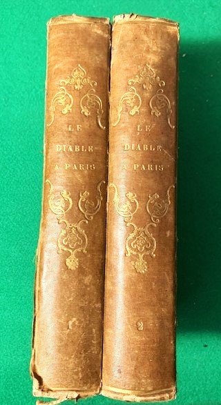In 4°; (4), XXXII, 380 pp. e (99) c. di tav. e (4), LXXX, 364 pp. e (112 c. di tavola). Legatura coeva in piena tela marrone con cornici a secco ai piatti. Qualche lieve segno del tempo e piccole mancanze di tela in corrispondenza delle cerniere e dei margini inferioriTitolo, numero del volu,e e rocchi fregi in oro al dorso. Un piccolo strappetto senza perdita di carta al margine superiore di una ventina di carte, ininfluente. Qualche minima macchiolina di foxing in una ventina di carte, anche questo ininfluente. Nel complesso esemplare in buone condizioni di conservazione. Antiche note bibliografiche, note di posesso manoscritte a matita al contropiatto e alle prime carte che identificano l'esempalre come appartenuto al noto critico d'arte italiano, Giulio Bariola. Esemplare con un totale di 211 tavole sulle 212 annunciate. Alcuni esemplari prsentano una carta di Parigi qua, come nella maggior parte degli esemplari, mai aggiunta. Prima edizione. Più di 800 illustrazioni nel testo. Prima edizione di questa famosa descrizione "fisiologica" e umoristica di Parigi e dei parigini, uno dei migliori libri illustrati dell'epoca, sia per il testo firmato da alcuni dei più grandi srittori dell'epoca che per la vivacità e l'alacrità delle illustrazioni. 100 tavole sono opera del grande illustratore Gavarnì. L'opera contiene lavori di George Sand, P. J. Stahl, Leon Gozlan, P. Pascal, Frederic Soulie, Charles Nodier, Eugene Briffault, S. Lavalette, Honore de Balzac, Taxile Delord, Alphonse Karr, Mery, A. Juncetis, Gerard de Nerval, Arsene Houssaye, Albert Aubert, Theophile Gautier, Octave Feuillet, Alfred de Musset, e Frederic Berat. Rif. Bibl.: Vicaire (III, 243).