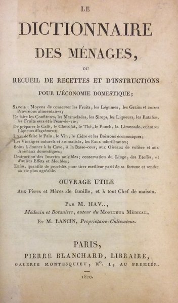 In-8 p. (mm. 201x127), mz. pergamena coeva, titolo oro su tassello al dorso, pp. VIII,517. Il dizionario tratta: Moyens de conserver les fruits, les légumes, le grains.. - De faire les confitures, les marmelades, les sirops, les liqueurs, les ratafias, les fruits secs.. - De préparer le café, le chocolat, le thé, le punch, la limonade.. - l'art de faire le pain, le vin, le cidre et les boissons économiques - Les vinaigres naturels et aromatisés.. - Soins à donner à la cave, à la basse-cour, aux oiseaux de volières et aux animaux domestiques - Destruction des insectes nuisibles; conservation du linge, des étoffes, des meubles - Enfin quantité de procédés pour tirer meilleur parti de sa fortune et rendre sa vie plus agréable. "Prima edizione".Cfr. Vicaire, p. 439 - Bitting, p. 219.Prime 3 carte restaur. per strappo, ma certam. un buon esemplare.