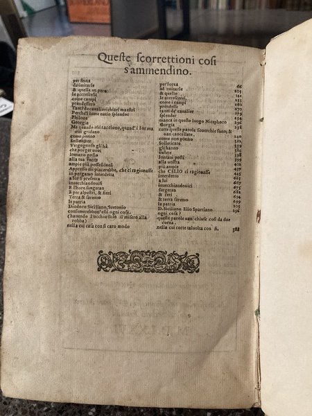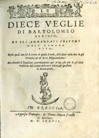In-4° (215x150mm), pp. (12), 700, (12) di indici ed errata (l'indice, su due colonne, è riquadrato tipograficamente), (2) bianche, legatura antica piena pergamena rigida con titolo manoscritto al dorso. Testatine e capilettera figurati incisi in xilografia. Carattere italico. Registro al colophon. Sparsi aloni e arrossature leggere. Buon esemplare. Prima edizione di questo trattato di morale ripartito in dieci 'veglie', che si fingono tenute fra amici nella casa bresciana di Orrensio Domizio; l'opera fu anche tradotta in francese da Pierre de Larrivey (Troyes, 1608). I conversari hanno per oggetto i più vari temi legati alla morale: la ricerca del bene e della felicità, l'ignoranza come fattore di inclinazione al male, l'ubriachezza, gli effetti dell'ira e dell'impazienza, l'eccesso di curiosità, i giochi leciti e illeciti, la vera religione, la vergogna, la temperanza, il matrimonio, la menzogna, etc. L'Arnigio (Brescia, 1523-ivi, 1577) fu letterato, poeta di intonazione petrarchesca e medico, membro dell'Accademia degli Occulti. STC Italian, p. 56. Adams, A-1990. Brunet, I, p. 491. Graesse, I, p.225. Passano, Novellieri, I, p. 28. B.I.N.G., 95. Olschki, Choix, 1752. Sull'Arnigio: Rossi, Elogi istorici de' Bresciani illustri, pp. 390-392; Cozzando, Libraria Bresciana, pp. 49-51; Mazzuchelli, Gli Scrittori d'Italia, I, 2, pp. 1109-1112.