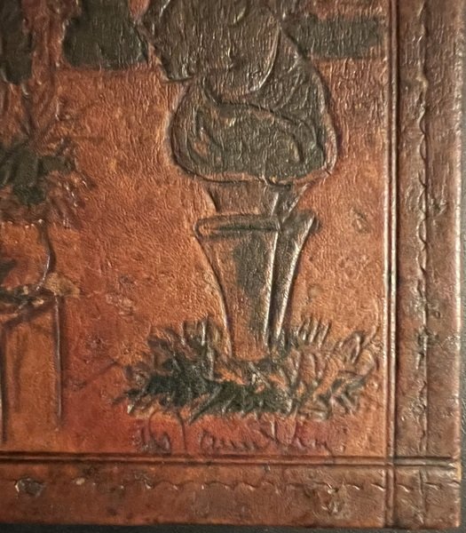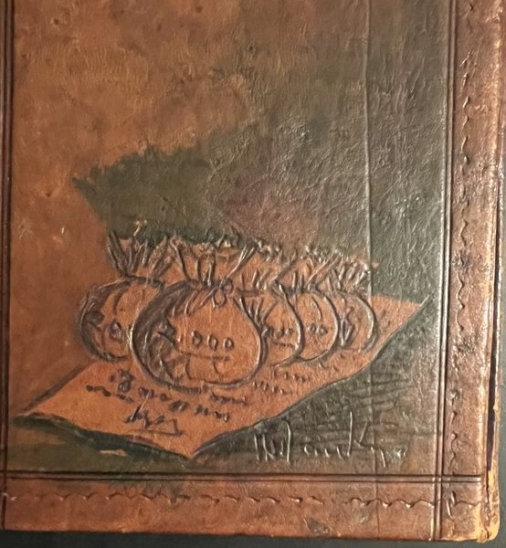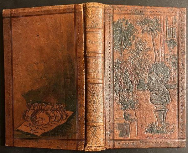 17,5x11,5 cm., stupenda legatura d'artista, in piena pelle, in unico esemplare, con disegni d'alberi e busti impressi a secco e a rilievo, firmata dall'artista al piatto posteriore, dorso con 6 nervi e fregi e titoli incisi a secco, pagg.238, tagli in leggero color rosa, prima edizione, in francese, eesmplare di grande pregio per la sua eccezionale legatura.