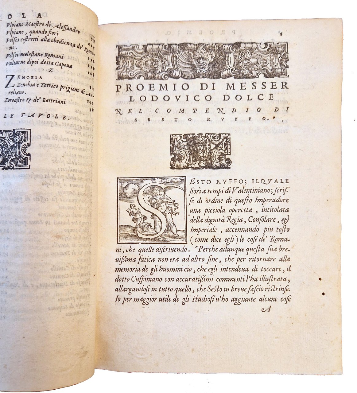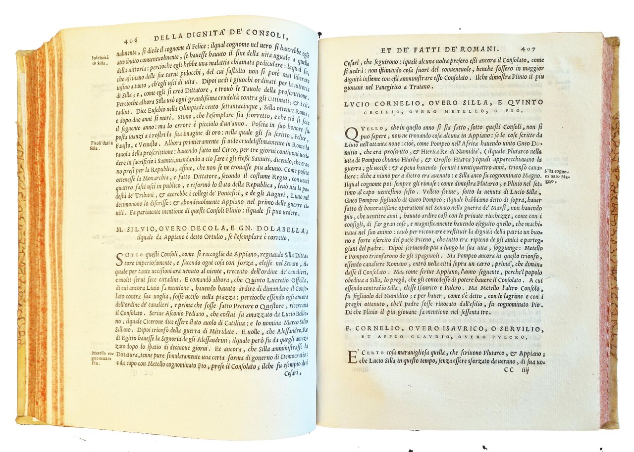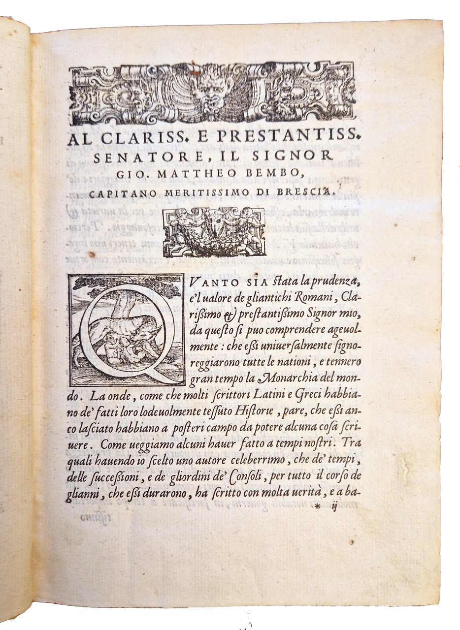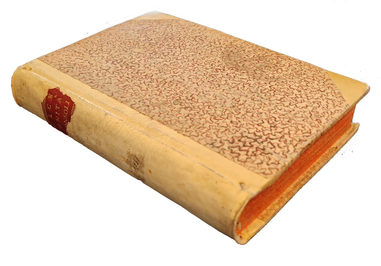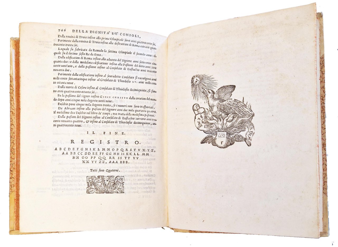 in-4°, 210x150 mm, leg. in pergamena con angoli e carta decorata ai piatti, tagli colorati a spruzzo di rosso; pp. [36], 766, [2]. Iniziali istoriate, testatine e finali xilografici. Marca tipografica xil. Del Giolito (fenice su fiamme che si sprigionano da anfora [iniz. G.G.F.], su base con sottoscrizione; ai lati 2 diavoli; motti: De la mia morte eterna vita io vivo. Semper eadem), e in fine (fenice, rivolta al sole, su fiamme che si sprigionano da globo alato recante le iniziali G.G.F; dimensioni: 6,3 x 7,7; motto: Semper eadem). Seconda ed. (la prima fu pubblicata nel 1560) di questo compendio della storia romana, tratto dagli scritti di Rufio Festo (Rufus Festus, Sextus; metà del IV secolo; funzionario e storico romano) e Magno Aurelio Cassiodoro (Cassiodorus, Flavius Magnus Aurelius; ca. 490-583; politico e letterato), rielaborato e tradotto da Ludovico Dolce ( 1508-1568), poligrafo, curatore editoriale dei Giolito, membro dell'Accademia della Fratta di Mantova e di quella veneziana dei Pellegrini). Rif.: IT\ICCU\TO0E\034321. CNCE 17369. OCLC, 14935905. Cond.: Modeste tracce d'uso alla legatura (parziali abrasioni e macchie alle carte dei piatti, mancanze all'etichetta con il titolo al dorso). Occasionale presenza di forellini di tarlo a margine di alcune carte. Rare macchie e bruniture ad alcune carte. Per il resto, esemplare in condizioni generali molto buone.