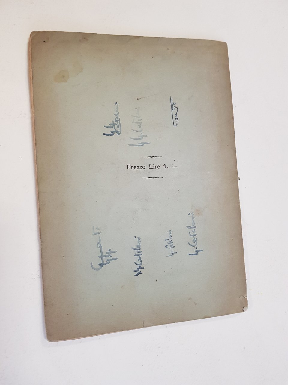 In 8° (cm. 20 x 14), pp. 67; brossura editoriale illustrata; cucito.<BR>CONDIZIONI BUONE: lievi mende al dorso; ingialliture al margine dei piatti; la copertina è attraversata dalla firma "Gustavo Rubin"; sul piatto posteriore una piccola firma più volte ripetuta.