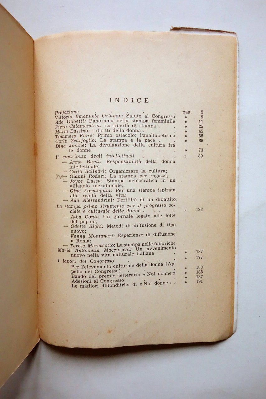 AA. VV., Le donne e la cultura A. Gobetti, P. Calamandrei, M. Bassino, T. Fiore, C. Scarfoglio, D. Jovine, M. A. Macciocchi prefazione di Sibilla Aleramo Edizioni Noi Donne, Roma 1953; cm 18x12; pp. 196 con ill. in b/n; brossura ed. con sovraccoperta ed. ill. a colori. Condizioni di conservazione Volume in buone condizioni con tracce d'uso; brossura con lieve marginale ingiallimento dovuti al tipo di carta e poche minime bruniture. Interni buoni. Sovraccoperta ed. in buono stato con alcuni minimi strappetti e qualche minuscola marginale mancanza; leggerissime tracce di sporco. SETT75.L25381 N