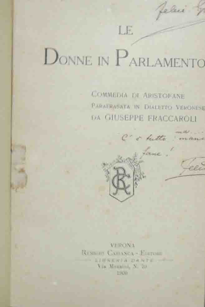 Le donne in parlamento. Commedia di Aristofane parafrasata in dialetto veronese da Giuseppe Fraccaroli, Remigio Cabianca Editore, Verona 1909, pp. 150, cm 19, legatura in mezza tela con titoli manoscritti al dorso. Firma d’appartenenza e data al frontespizio e alla prima pagina. Qualche piccola annotazione manoscritta in bella grafia al frontespizio, alla prima pagina e al margine di qualche carta interna, minime fioriture, per il resto perfetto. Estremamente raro.