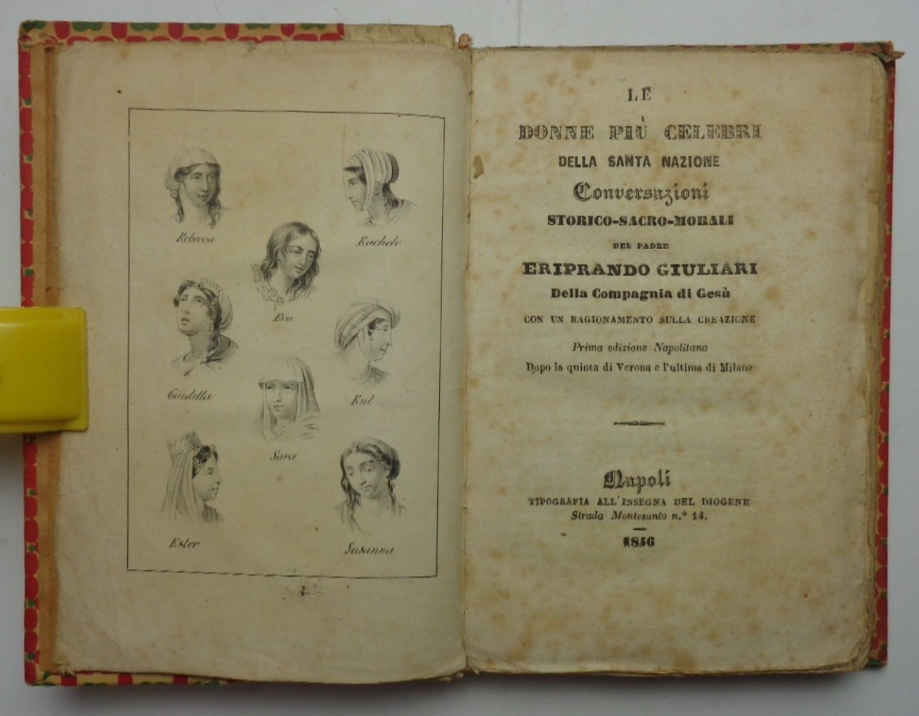 “Prima edizione napolitana, dopo la quinta di Verona e l'ultima di Milano”. Un volumetto (10,5x16 cm) di 292 pagine. In barbe. Antiporta con ritratto delle otto donne descritte nell’opera (Eva, Sara, Rebecca, Rachele, Rut, Giuditta, Ester, Susanna). Qualche fioritura o brunitura. Legatura moderna in mezza tela con tassello di titolo al dorso. Buone condizioni.