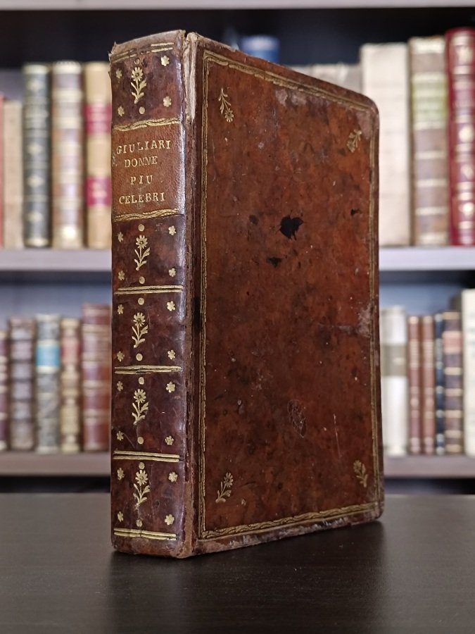 In-8° (cm. 17,7), deliziosa legatura coeva in piena pelle, piatti inquadrati da cornici con fregi floreali agli angoli interni sempre in oro, dorso liscio con titolo in oro su tassello, doppi filetti e fregi floreali in oro (alcune tracce d'usura alle cerniere), labbri ornati in oro, tagli rossi, risguardi marmorizzati; pp. 474 in stato molto buono; poche bruniture, lievi fioriture sparse. Celebre opera che illustra in forma di dialoghi i caratteri e le vicende delle figure bibliche femminili. Ottimo esemplare. (NA9)