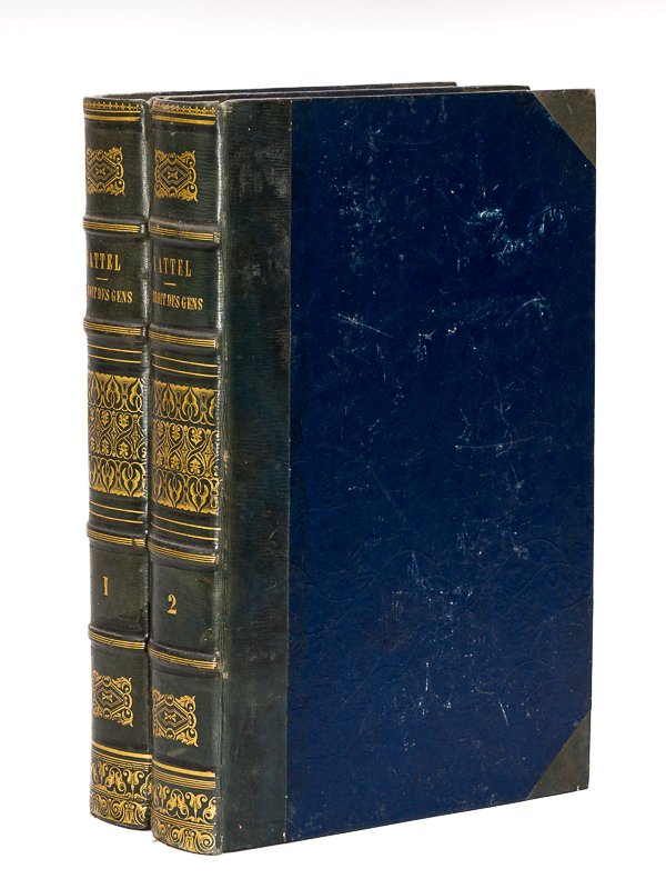 Edition précédée d'un Essai (de l'Auteur) sur le Droit Naturel, pour servir d'introduction à l'étude du Droit des Gens ; illustrée de Questions et d'Observations par M. le Baron de Chambrier d'Oleires, ancien Ministre ; Avec des Annexes nouvelles de M. de Vattel et de M. J.-G. Sulzer et un Compendium bibliographique du Droit de la Nature et des Gens et du Droit Public moderne par M. le Comte d'Hauterive, 2 vol. in-8 reliure demi-maroquin à petits coins vert, dos à 4 nerfs richement orné, papier gaufré bleu à motif floral en plats, Chez Rey et Gravier, Paris, 1838 - 1839, 2 ff., xxxix-477 ; 2 ff., 622 pp. Bel exemplaire de cet ouvrage, l'un des titres fondateurs du droit international. Fils de pasteur, influencé par la philosophie de Christian Wolff et la morale de Leibniz, Emer de Vattel (1714-1767) y défend notamment la théorie de la protection diplomatique. Bel exemplaire (très petit mq. de papier au second plat du tome 2, qq. rouss., très bel état par ailleurs) de cette édition peu commune et enrichi d'importantes annexes.