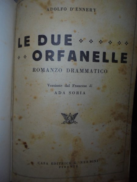 D' ENNERY, Adolfo - Casa Editrice G. Nerbini Firenze, 1933. Romanzo drammatico. Versione dal francese di Ada Soria. In-8°, m. tela, 246 pp. con numerose tavole in monocromia f.t. Alcune macchioline giallognole sparse dovute alla qualità della carta ma ben conservato in una legatura amatoriale. Neg. mob. nuovo