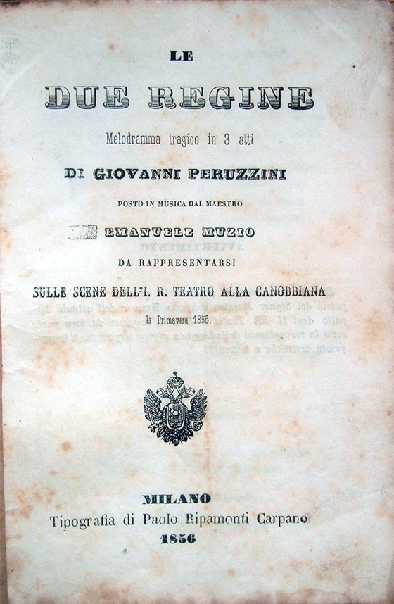 Le due regine. Melodramma tragico in 3 atti di Giovanni Peruzzini posto in musica dal Maestro Emanuele Muzio, da rappresentarsi sulle scene dell'I. R. Teatro alla Canobbiana la Primavera 1856