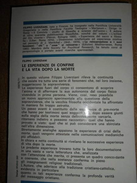 FILIPPO LIVERZIANI. Roma, Edizioni Mediterranee, 1986. Le Esperienze di confine e la vita dopo la morte. In-8°, br. 223 pp. Come nuovo. Uff. stanzetta mob. piccolo a destra
