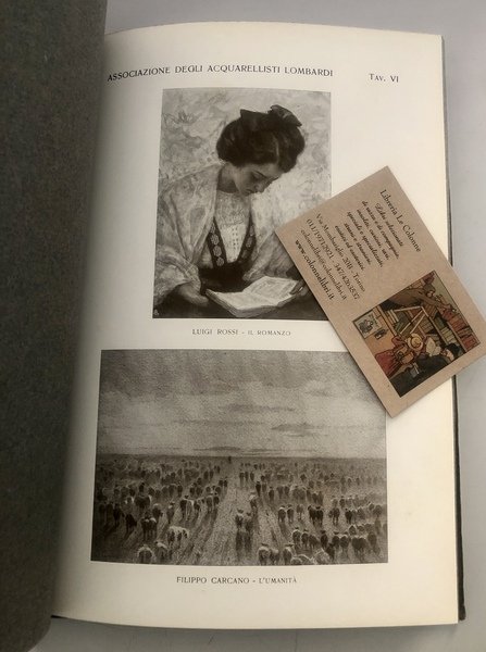 Elegante sobrio volume in-8° (cm. 24x17,2), pp. 18 + 5 TAVOLE applicate a collage e protette da velina su spesso supporto in cartoncino grigio + 23 riproduzioni seppia in 12 TAVOLE in carta patinata fuori testo. Distinta veste tipografico-editoriale. Cartone rugoso grigio, emblema in oro entro cornice a secco al piatto. 1) Testo di Francesco VISMARA sul pittore BARGAGLIA, di cui sono elencate 57 opere e qui 6 riprodotte (una a colori). 2) Riproduzione di 6 acquerelli dell'Associazione Acquerellisrti alla sua prima esposizione (era stata fondata nel 1910): Paolo Sala (a col.), Renzo Weiss (a col.), Luigi Rossi, Filippo Carcano, Cesare Fratino, Achille Beltrame. 3) Esposizione ANNUALE, primavera 1911: Leonardo Bazzaro, Giorgio Belloni (i due a COLORI), Emilio Borsa, Giuseppe Mentessi, Ferrari Arturo, Landi Angelo, Anero Cagnoni, Giuseppe mascarini, Giuseppe Casciaro, Antonio Piatti, Riccardo Galli, Ambrogio Alciati, Lodovico Zambeletti, Pompeo mariani, Prassitele Barzaghi, Avhille Alberti. Censito in 9 bibl.