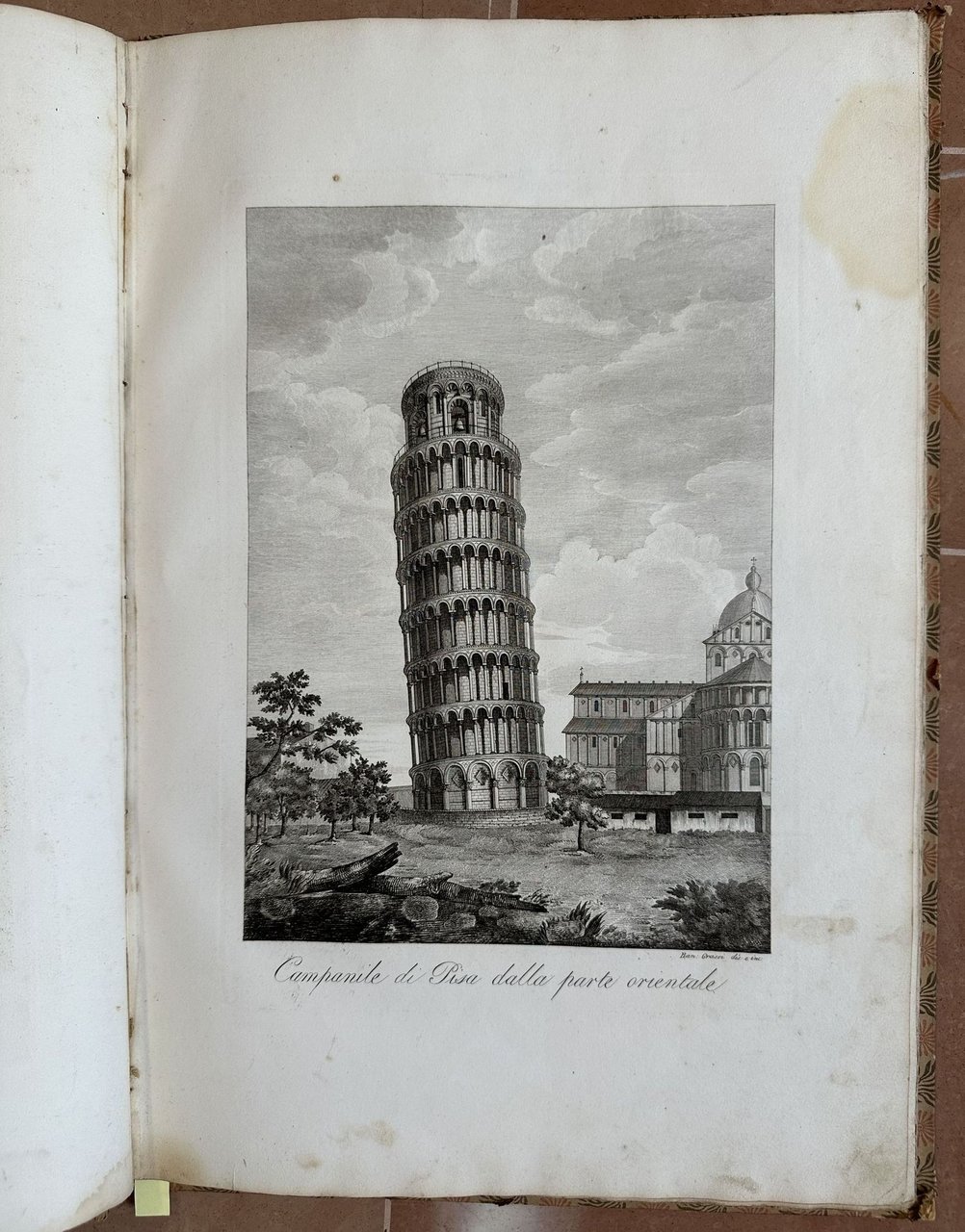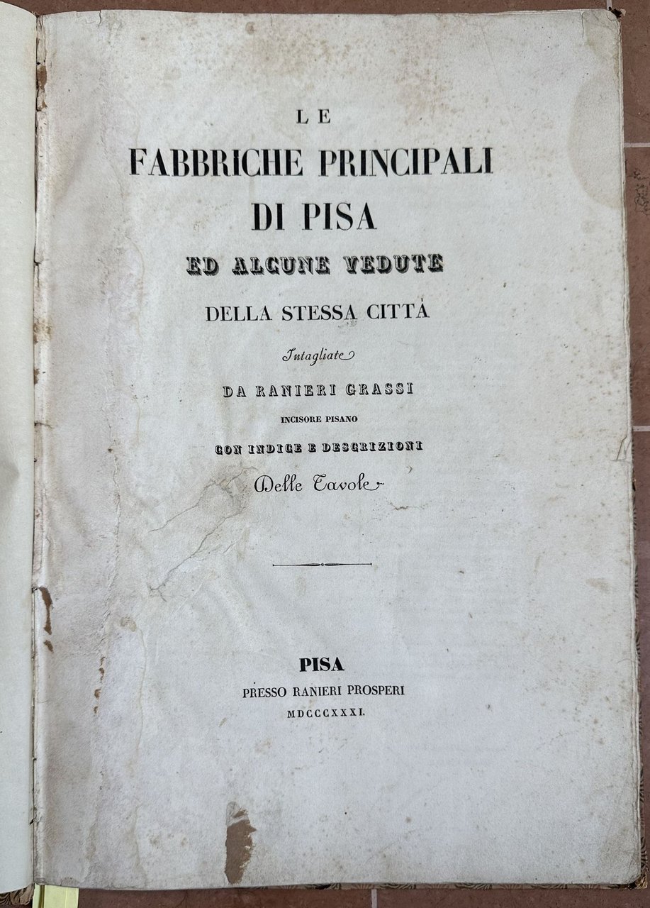 Prima rara edizione del 1831 della prima opera dell'incisore pisano Ranieri Grassi dedicata alla sua città. Dedica a Francesco Mastiani. Segue testo: descrizione del Duomo di Pisa, Battistero, Campanile di Pisa, Campo Santo, Piazza de Cavalieri, Campanile di San Nicola, Chiesa di S. Paolo a Ripa D'Arno, Santa Maria della Spina, Lungarno, Acquedotti di Nerone, Acquedotti moderni. Alla fine ventiquattro tavole incise a bulino su disegno di Francesco Giuliani, E. Gresy, G. L. Taylor: Pianta della città di Pisa, veduta della Piazza, Pianta del Battistero e vari prospetti, Piante del campanile; Piazza De Cavalieri, Campanile di S. Niccola, San Paolo a Ripa D'Arno e Chiesa di S. Maria della Spina, Lungarno, Acquedotti antichi e moderni, Ghiacciaia, Chiesa di Santo Stefano ecc. In buone condizioni. Copertina cartonata coeva con titolo manoscritto su etichetta al piatto anteriore in buone condizioni con usure e mancanze ai margini e dorso. Dorso assente. Legatura in buone condizioni. Pagine in buone condizioni con fioriture. Parti mancanti restaurate al frontespizio. In folio. cm 46x31,5. Pp. (4)+13+(1)+XXIV. Number of the 15th of august 1910 of this magazine of umbrian art. Inside: An inedit painting of Perugino; the monument to the Byshop Varino Faverino Camerte; Extreme dates of Fiorenzo di Lorenzo the date of his death; News about the art in Perugia; Local information (Bastia Umbra, Collazzone; Foligno, Gubbio, Perugia, Scandriglia; Scheggia; Urbino). Inside two plates covered by tissue paper. In good conditions Editorial cover in good conditions lightly worn in the extremities. Spine lacks. Binding ditoriarly lacks. Pages in good conditions with foxing. In 8. cm 25x17,5. Pp. 77-106.