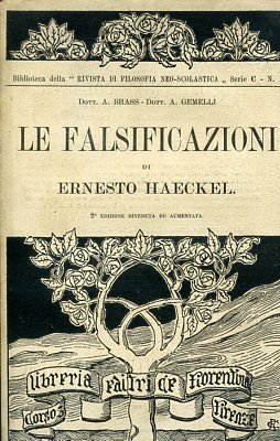 In-8°, pp. (8), 188, brossura editoriale illustrata xilograficamente. 4 tavv. embriologiche in b.n. in fine con relative esplicazioni testuali a fronte. Ottimo esemplare. Seconda edizione, riveduta e aumentata, di questo violento attacco di parte cattolica alle dottrine scientifiche di Ernest Haeckel (Potsdam, 1834-Jena, 1919) fu tra i massimi biologi del secolo decimonono; il volume contiene la traduzione di un volume tedesco del Brass e uno scritto a esso strettamente affine e complementare di padre Gemelli, entrambi avversi non solo ad Haeckel, ma a tutto l'evoluzionismo moderno postdarwiniano. L'Haeckel, allievo di Virchov, professore di zoologia a Jena, scrisse molte e poderose opere di zoologia e biologia, sia specialistiche che divulgative, di volgarizzamento del darwinismo, da lui interpretato e corretto sotto l'influenza della filosofia della natura di Goethe. Una visione rigorosamente meccanicistica e causalista permeò tutte le sue dottrine, paradigmatiche del materialismo positivistico. Biblioteca della 'Rivista di Filosofia Neo-Scolastica', serie C, n. 1.