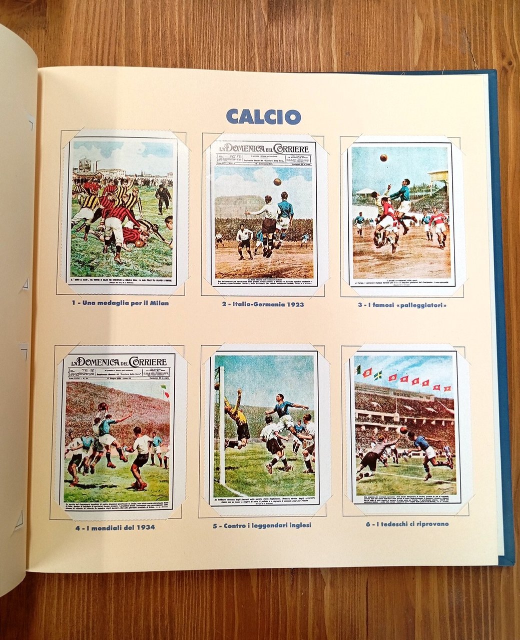 Album in copertina rigida editoriale in tela blu con titolo e fregi in oro al piatto e al dorso. Contiene 120 figurine a colori inserite in appositi ritagli e suddivise in 20 sezioni tematiche, dallo sport alla cronaca, dalla religione al costume. Esemplare in ottime condizioni.