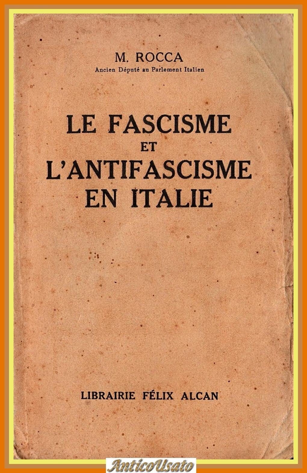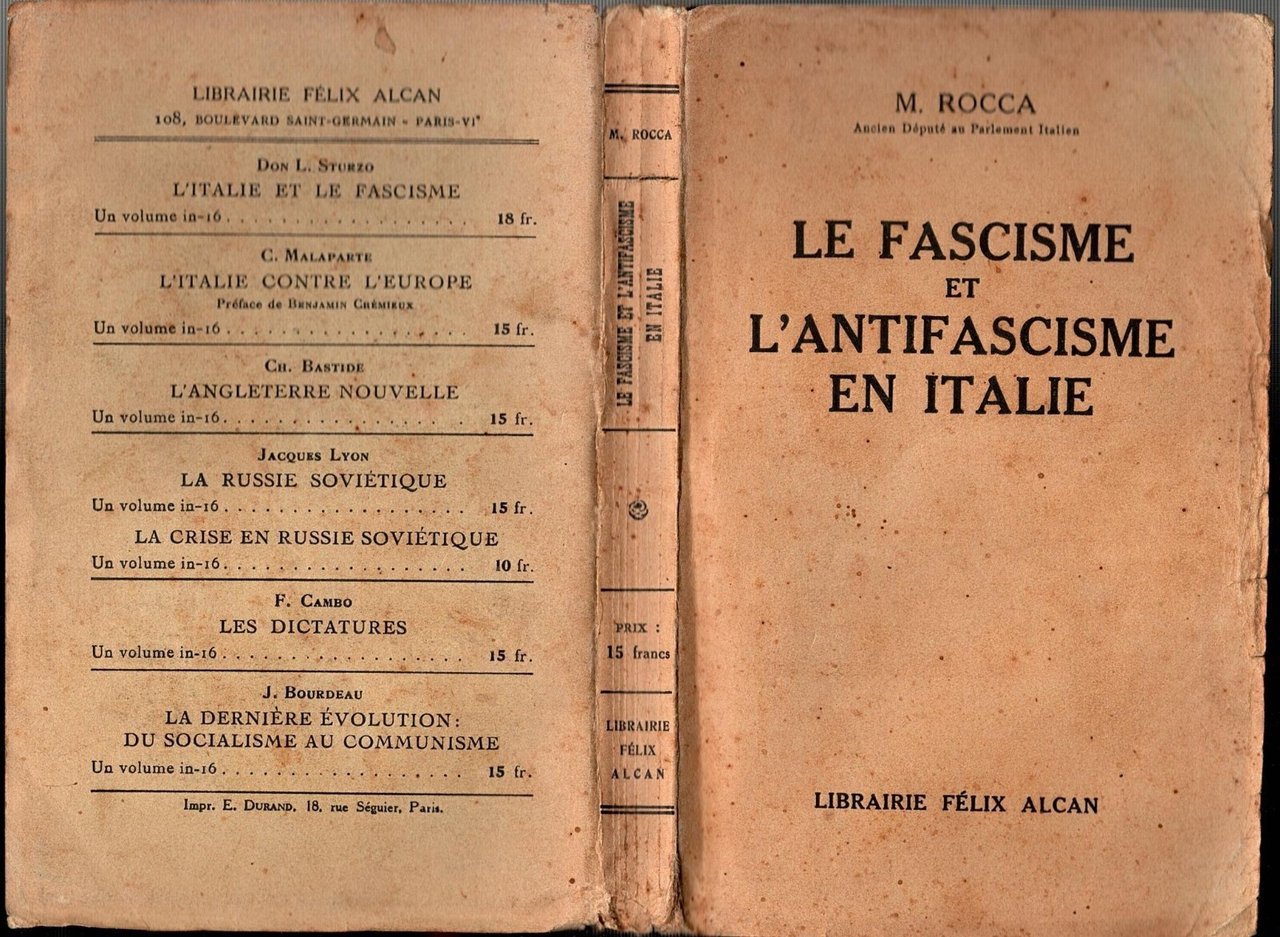 LE FASCISME ET L'ANTIFASCISME EN ITALIE di M. Rocca. Felix Alcan Editore, 1930 . VI, 215 pagine. Copertina editoriale in brossura. Stato di conservazione: buono (pagine ingiallite, firma di appartenenza, copertina sporca) Libro usato saggistica storia politica