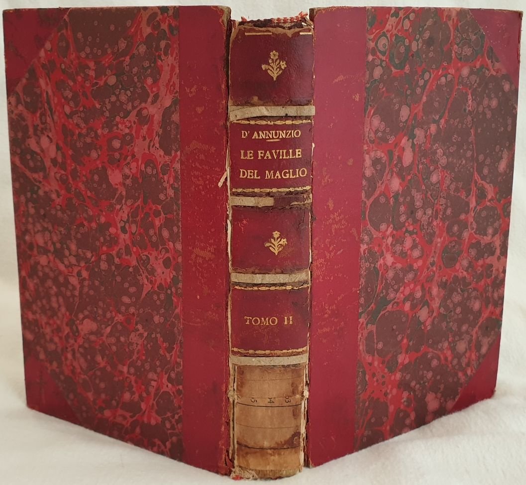 Edizione del 1928 di quest'opera dello scrittore, poeta, drammaturgo, politico e giornalista Gabriele D'Annunzio (1863-1938) della raccolta "Le faville del Maglio". Siamo in possesso del tomo secondo solamente "Il compagno dagli occhi senza cigli e altri studii del vivere inimitabile". Copertina in mezza pelle coeva con titolo e decorazioni in oro al dorso. Brossura editoriale conservata all'interno. Ex libris nobiliare al contropiatto anteriore. In buone condizioni. Copertina in mezza pelle coeva con titolo e decorazioni in oro al dorso in discrete condizioni generali con usure e parti mancanti ai margini e dorso. Rotture alle cerniere. Legatura in buone condizioni. All'interno le pagine si presentano in ottime condizioni con rare fioriture. In barbe. In 8. Dim. 20x13,5 cm. Pp. 386.<BR>Beautiful edition of 1928 of this work written by the italian writer, poet, dramawriter, politician and journalist Gabriele D'Annunzio (1863-1938) of the collection "Le faville del Maglio". We only have the second tome only "Il compagno dagli occhi senza cigli e altri studii del vivere inimitabile". Half leather coeval cover with golden title and decorations in the spine. Editorial cover preserved inside. in good conditions. Noble ex libris in the internal part of front plate. In good conditions. Half leather coeval cover with golden title and decorations in the spine in fair general conditions slightly worn with missing parts in the edges and spine. Cracks in the hidges. Binding in good conditions. Inside pages are in very good conditions with occasional foxings. Uncut copy. In 8. Dim. 20x13,5 cm. Pp. 386.<BR>
